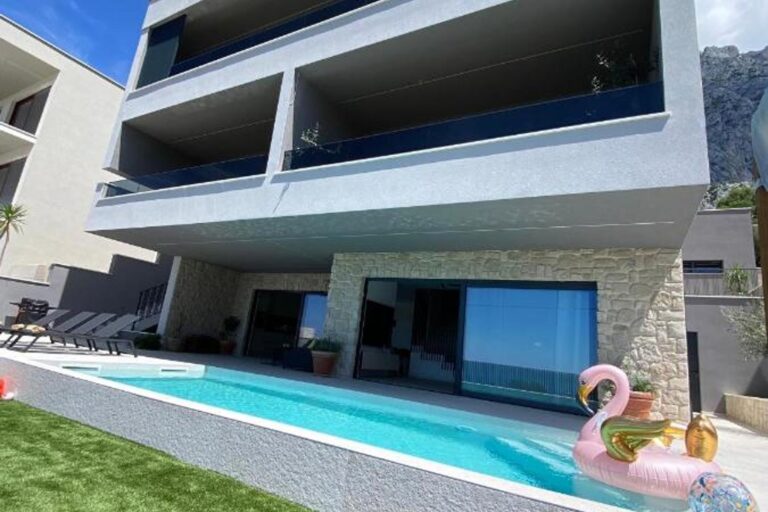 Komfortowe mieszkanie z basenem i widokiem na morze w Makarskiej Ekskluzywne mieszkanie z trzema sypialniami usytuowane na drugim piętrze nowoczesnego budynku zapewnia wyjątkowy komfort i prywatność....
