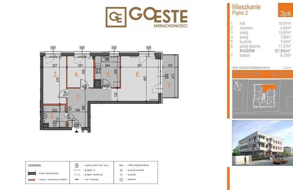 Mieszkanie o powierzchni 60,27 m2 znajduje się na II piętrze, II piętrowego budynku.
