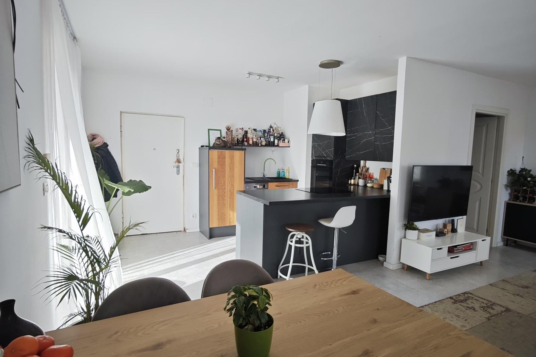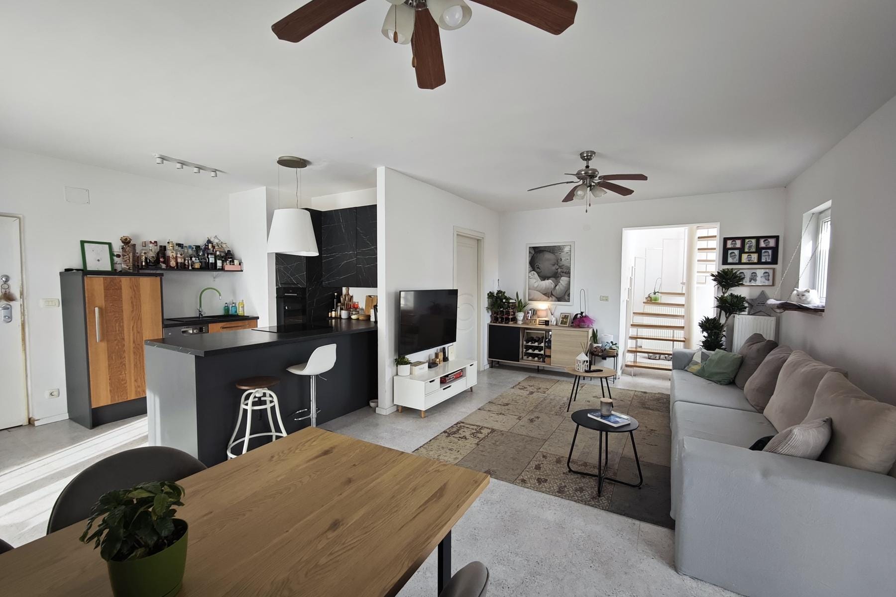 Układ mieszkania obejmuje przestronny salon z jadalnią oraz otwartą kuchnię, które tworzą reprezentacyjną część dzienną. Na dwóch kondygnacjach rozmieszczono również pokoje i łazienki, co zwiększa prywatność mieszkańców. Duży taras umożliwia wypoczynek na świeżym powietrzu przy widoku na okolicę.
