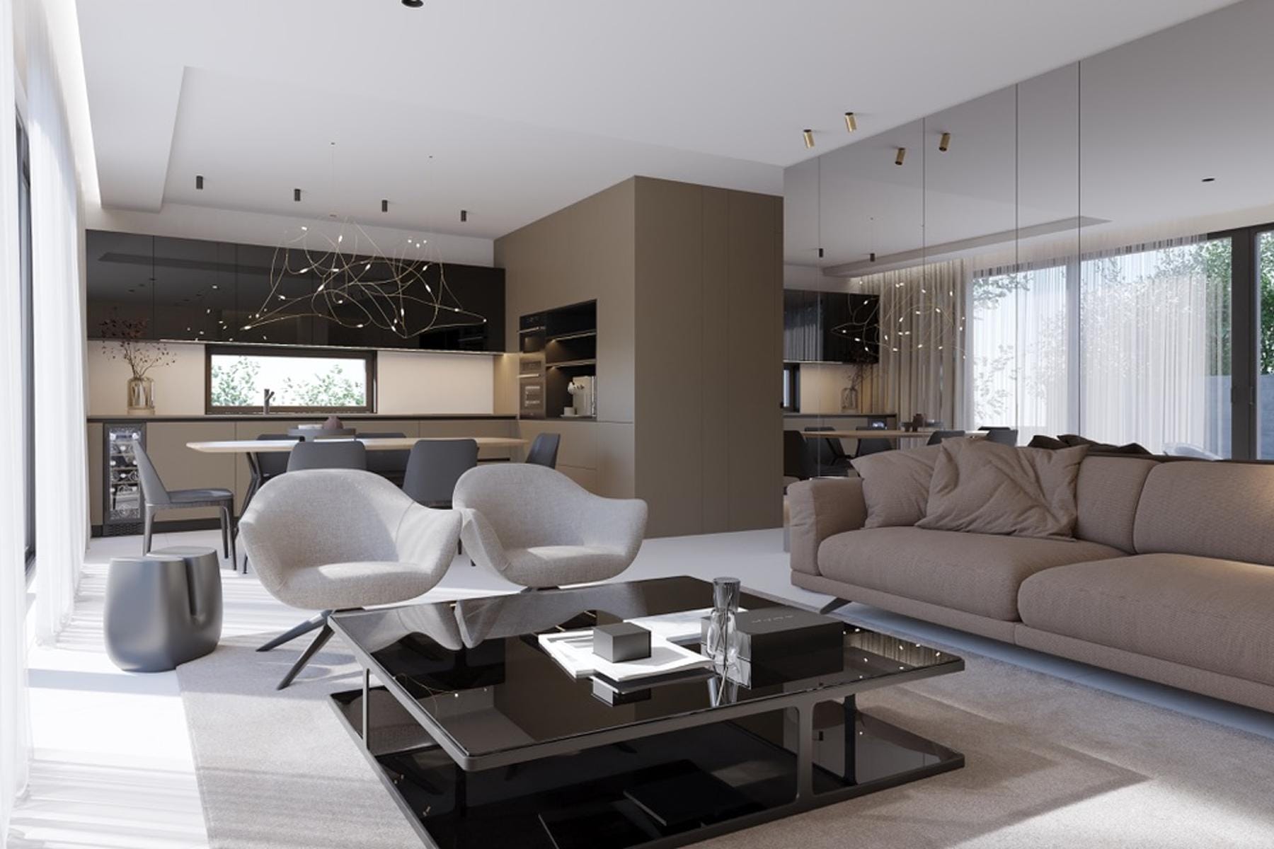 Duża, zadaszona powierzchnia tarasu zachęca do spędzania czasu na świeżym powietrzu, chroniąc przed nadmiernym słońcem i deszczem. Ogród otacza dom zielenią, a basen stanowi idealne miejsce na ochłodę podczas ciepłych dni. Pergola z miejscem do grillowania umożliwia organizację spotkań na łonie natury.
