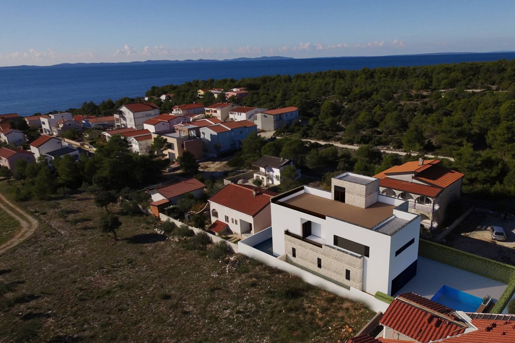 W sercu malowniczej wyspy Vir powstała wyjątkowa nieruchomość, łącząca komfort i funkcjonalność. Oferuje przestronne wnętrza o wysokim standardzie wykonania, wśród których znajdują się jasna kuchnia połączona z jadalnią i salonem. Trzy sypialnie oraz trzy łazienki zapewniają wygodę całej rodzinie lub grupie gości. Duża, 200-metrowa przestrzeń ogrodu i prywatny basen zachęcają do spędzania czasu na świeżym powietrzu. To miejsce zadowoli osoby ceniące spokój, jak również bliskość morza i natury.