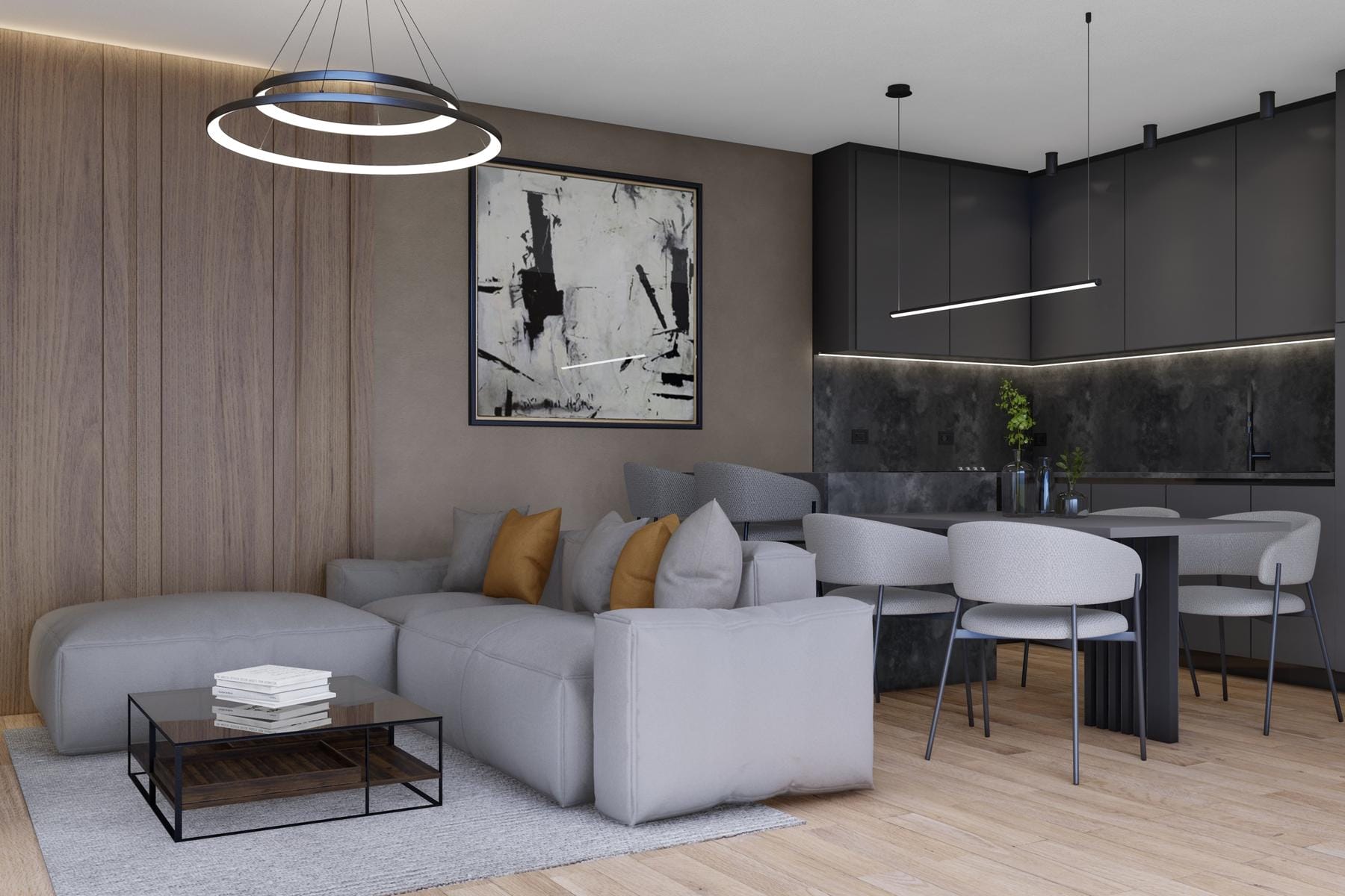 Mieszkanie zostało wykonane z dbałością o detale, co widoczne jest w starannie dobranych materiałach i estetyce wnętrz. Otwarta przestrzeń łącząca kuchnię i salon sprzyja integracji oraz ułatwia codzienne funkcjonowanie.