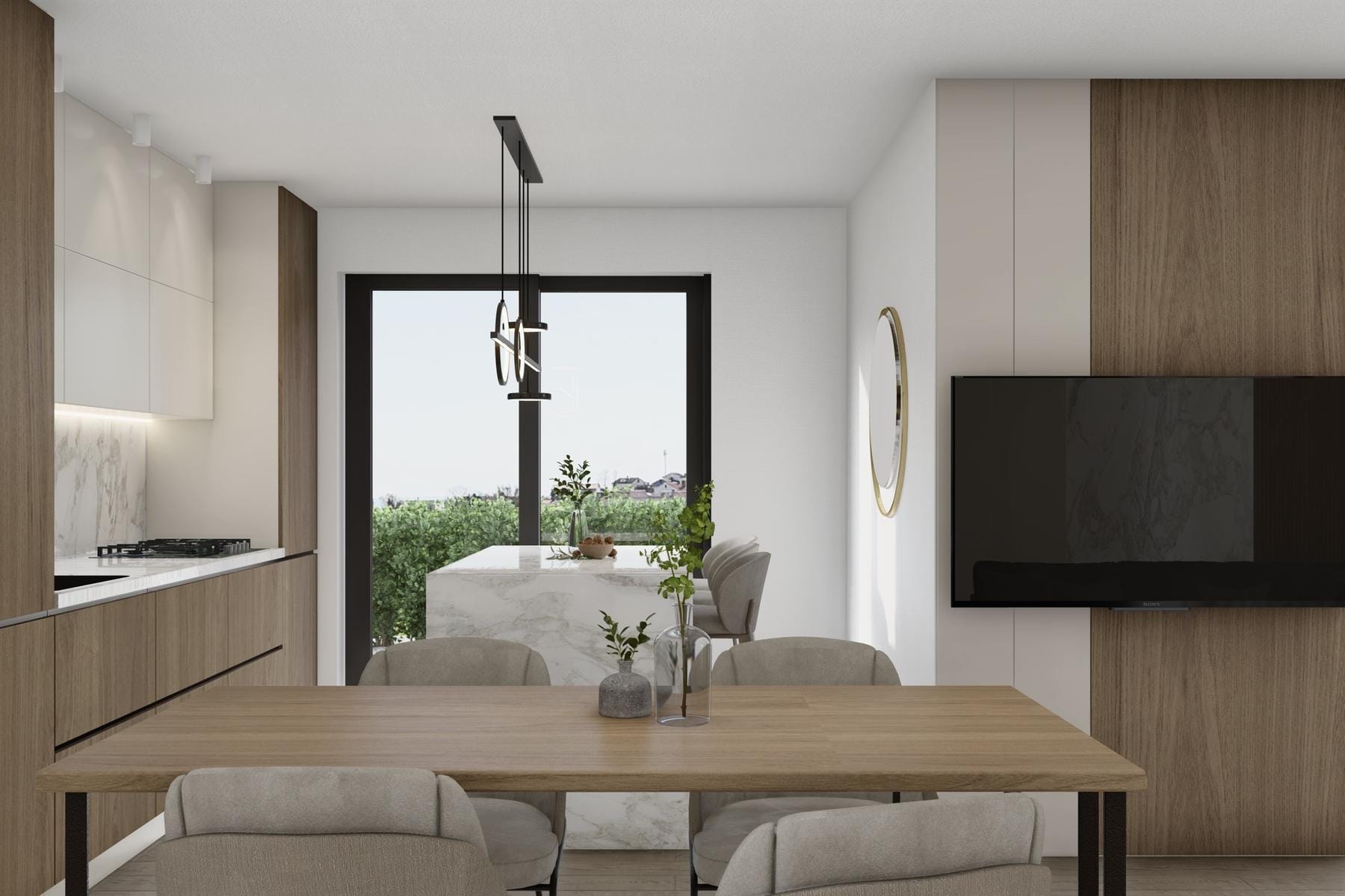 Wnętrza mieszkania zostały starannie zaprojektowane, by zapewnić maksymalną wygodę mieszkańcom. Wchodząc do środka, można od razu poczuć przyjazną atmosferę. Otwarta przestrzeń kuchni, jadalni i salonu zwiększa poczucie przestronności. Dwie sypialnie sprawiają, że lokal świetnie nadaje się na rodzinne miejsce zamieszkania lub jako apartament wypoczynkowy.