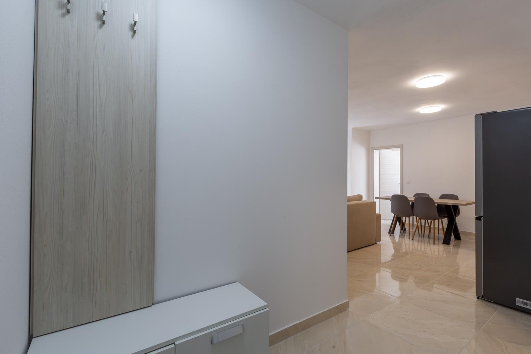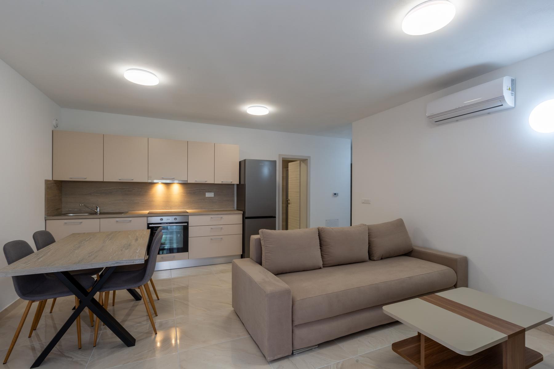 Mieszkanie położone jest na pierwszym piętrze i obejmuje przemyślanie rozplanowaną przestrzeń. Składa się z dwóch pokoi oraz łazienki, co czyni je idealnym wyborem dla pary lub małej rodziny. Jasne wnętrza oraz wysokiej jakości wykończenia tworzą przytulną atmosferę sprzyjającą wypoczynkowi po dniu pełnym aktywności. To propozycja dla osób poszukujących komfortowego miejsca do życia lub inwestycji w atrakcyjnej lokalizacji nad Adriatykiem.