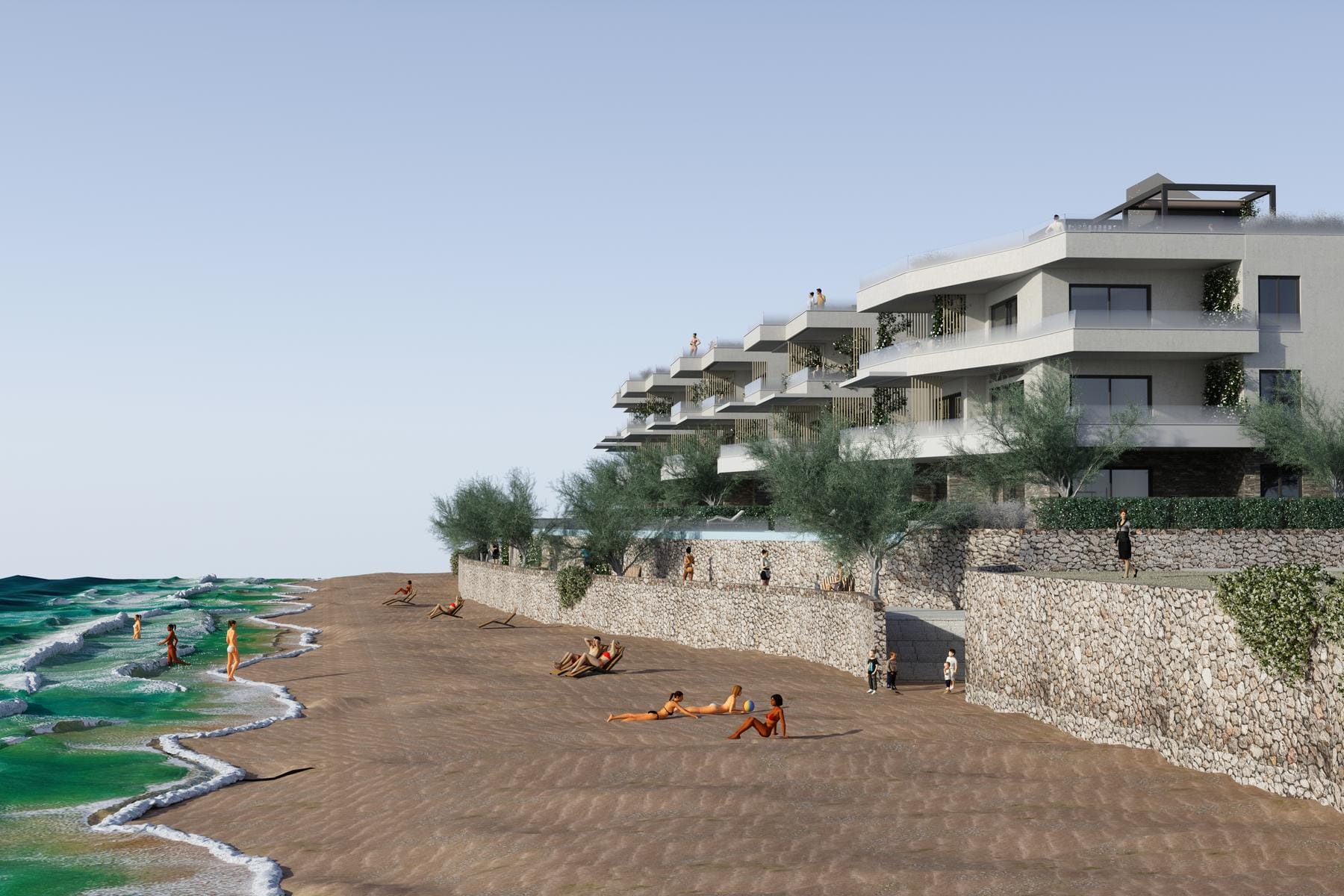 Mieszkanie znajduje się na drugim piętrze nowoczesnego budynku położonego bezpośrednio przy plaży Perilo. Całkowita powierzchnia użytkowa wynosi 76 m², co obejmuje przestronny salon z aneksem kuchennym, dwie sypialnie oraz dwie łazienki. Dodatkowym atutem jest taras i balkon o łącznej powierzchni 13,5 m², które oferują relaksujące widoki na morze.