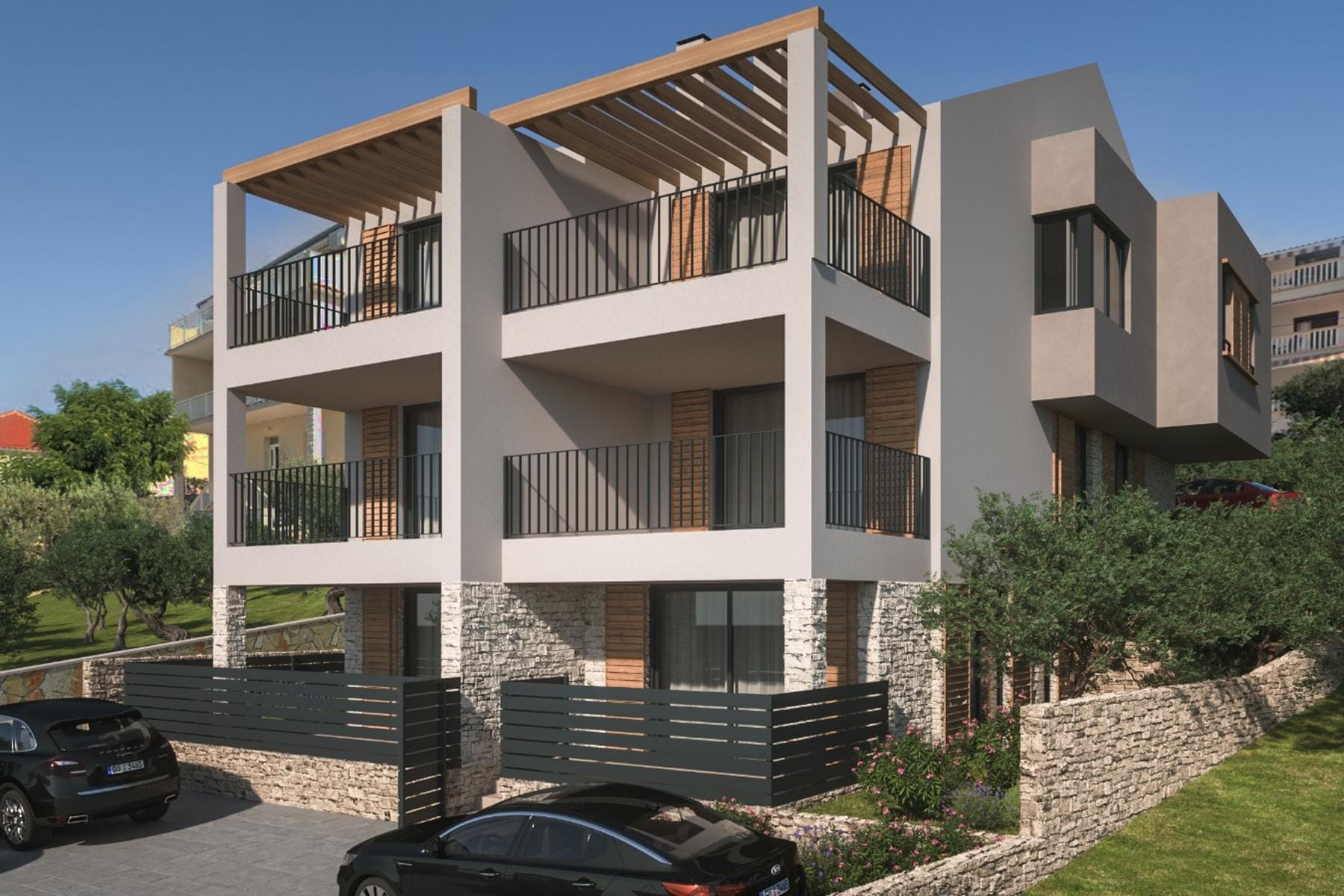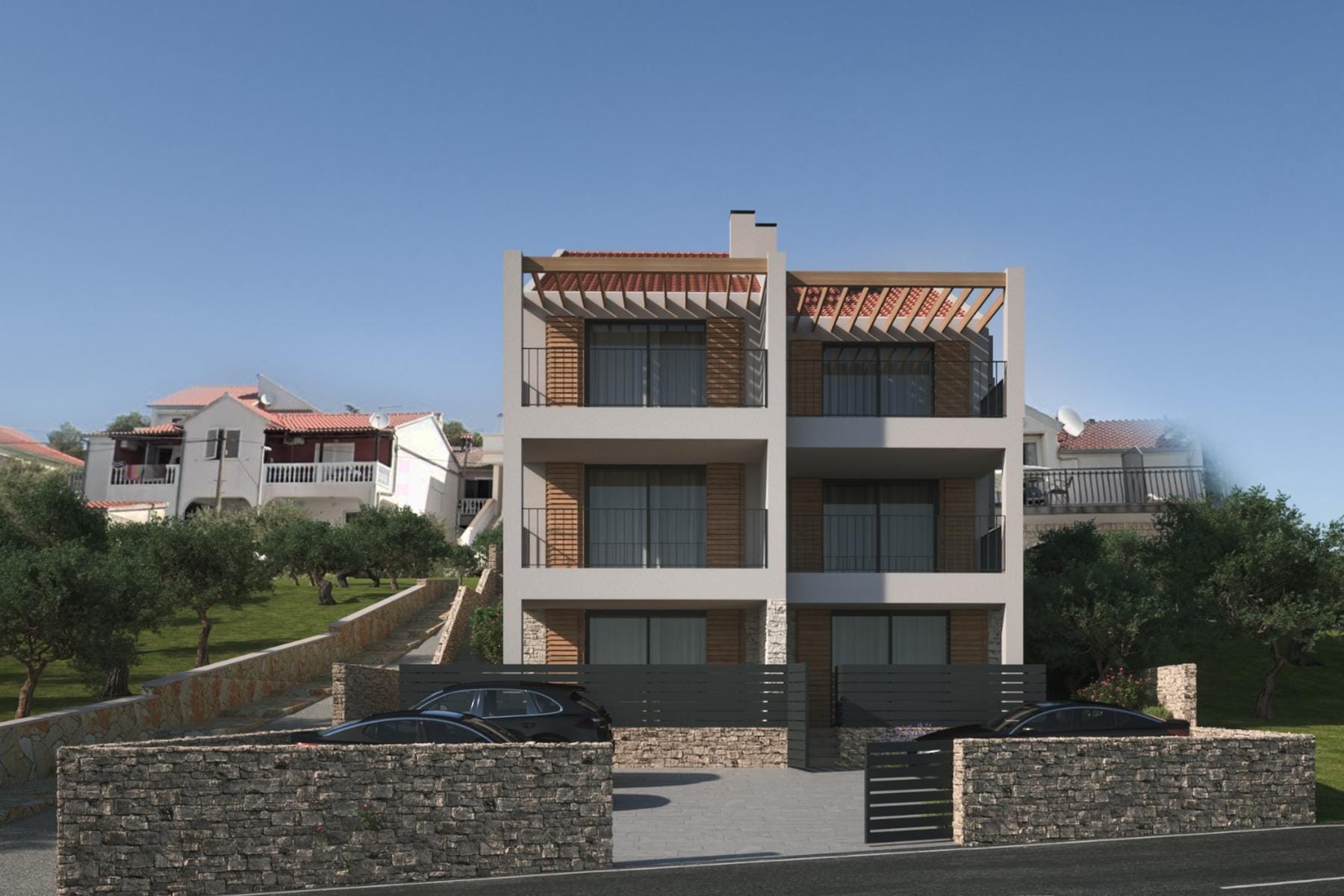 Ta nieruchomość wyróżnia się nowoczesnym stylem oraz wysoką jakością wykończenia. Budynek składa się z sześciu apartamentów rozmieszczonych na trzech kondygnacjach. Lokalizacja w pierwszym rzędzie do morza zapewnia niezakłócony widok oraz łatwy dostęp do plaży.
