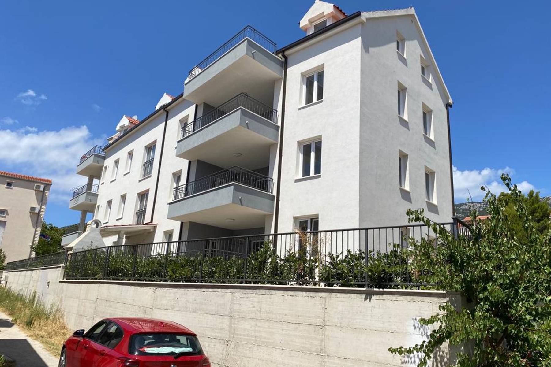 Do mieszkania przynależy duży ogród, balkon oraz loggia, które wyraźnie zwiększają powierzchnię użytkową oraz podnoszą atrakcyjność całej nieruchomości. Przestrzenie zewnętrzne pozwalają spędzać czas na świeżym powietrzu bez konieczności wychodzenia poza własną działkę. Taka aranżacja daje doskonałe możliwości zarówno do aktywnego wypoczynku, jak i spotkań z bliskimi. Budynek został zrealizowany z dbałością o najdrobniejsze detale, a sam apartament spełnia rygorystyczne standardy jakościowe. Całość otoczona jest zielenią w spokojnej części uroczego miasteczka Bol.
