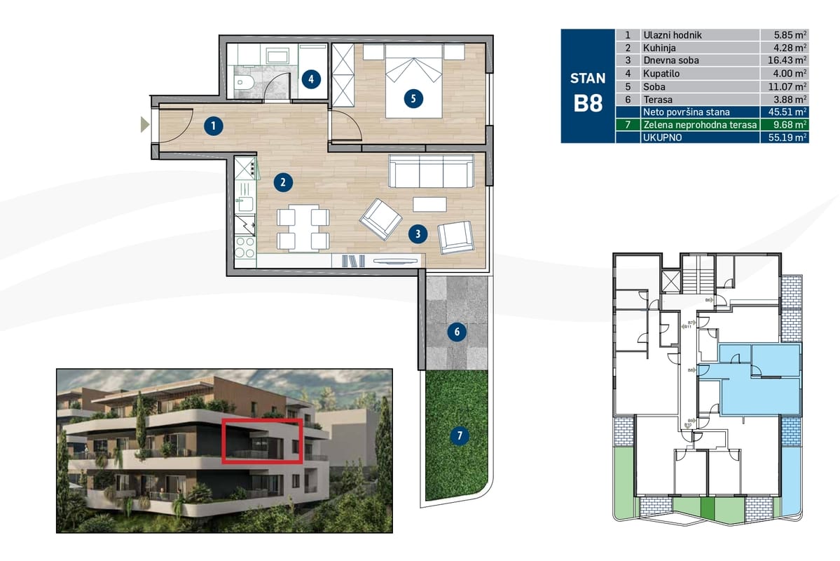 Apartament Boka Bay w Kotorze to propozycja dla tych, którzy cenią sobie komfort, nowoczesność i bliskość natury. Zlokalizowany na pierwszym piętrze, oferuje przestronny salon z kuchnią i jadalnią o otwartym planie, sypialnię, łazienkę oraz taras z zielonym otoczeniem. Tylko 300 metrów dzieli go od malowniczego wybrzeża, a otoczenie palm, sosen i oleandrów zapewnia spokój i relaks. Dodatkowymi atutami kompleksu są odkryty basen, plac zabaw dla dzieci i podziemny garaż. Apartamenty dostępne w różnych rozmiarach – od 27 m² do 250 m² – spełnią oczekiwania najbardziej wymagających. Zakończenie projektu przewidziane jest na lato 2024 roku, co czyni ten zakup wyjątkową okazją inwestycyjną.
