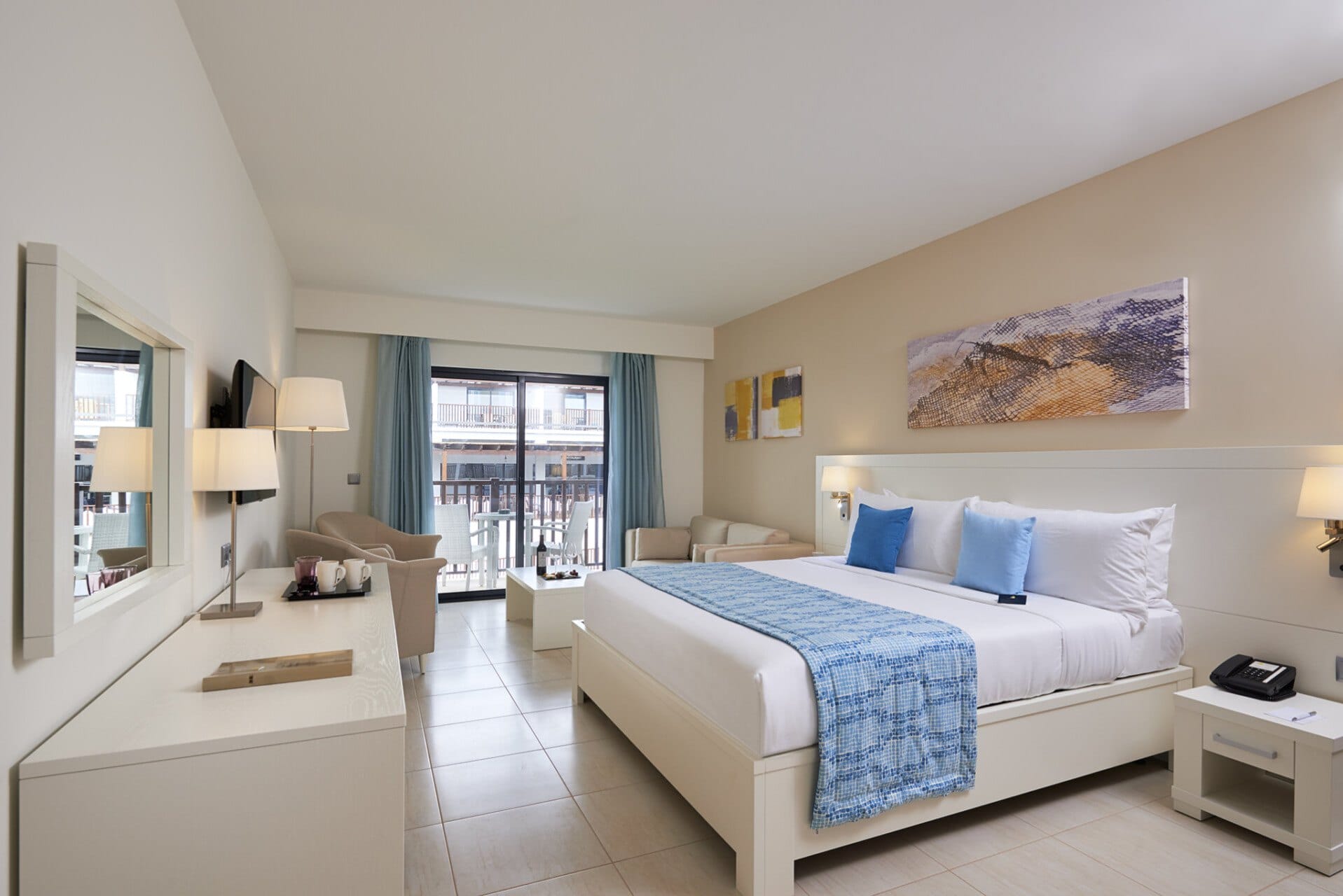 Część dzienna obejmuje duże, wygodne łóżko dwuosobowe, przestronną strefę wypoczynkową dla 4 osób, biurko, które może pełnić funkcję miejsca do pracy, oraz pojemną szafę wnękową.