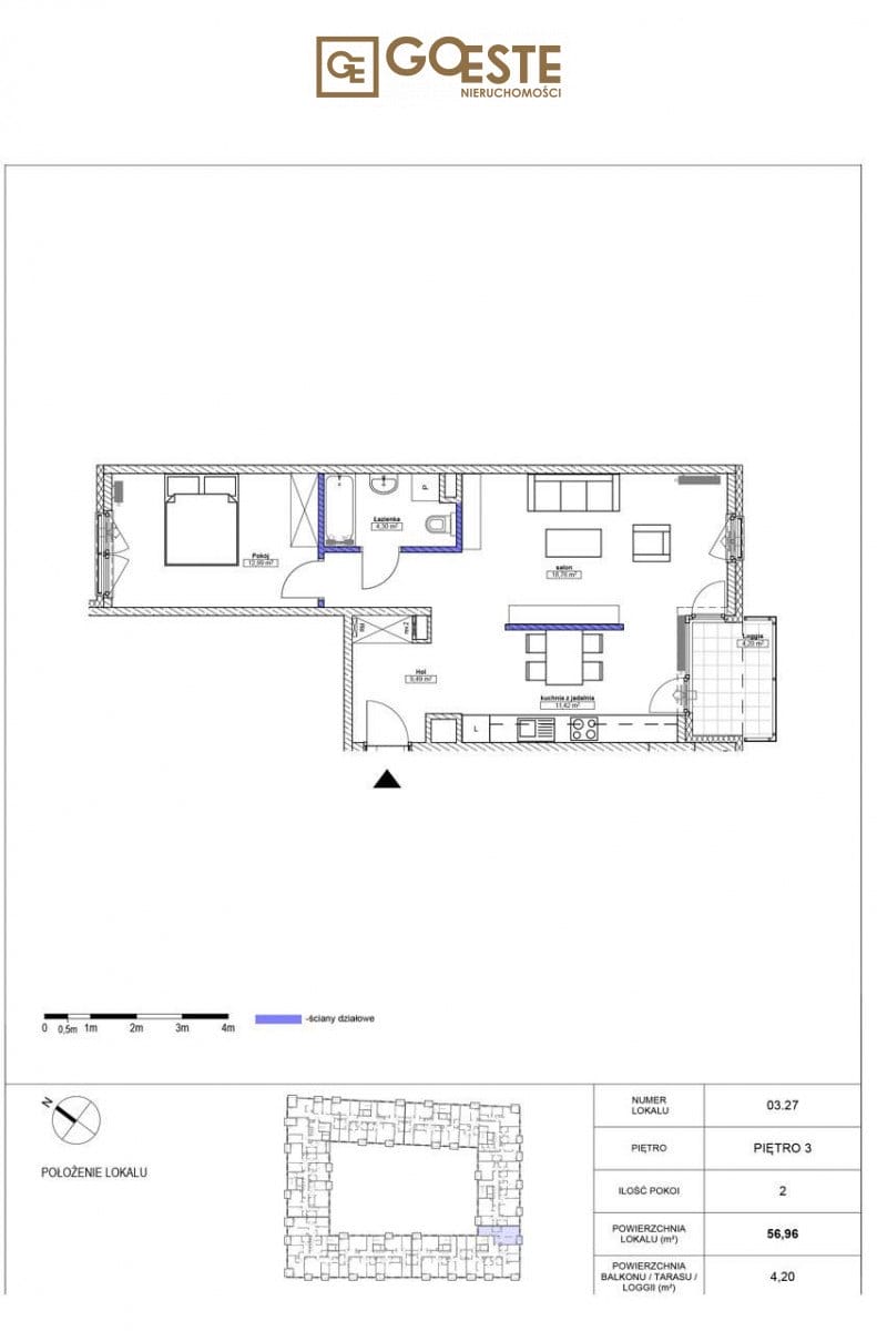 Mieszkanie 56,96 m2 , dwupokojowe na 3 pietrze w budynku 4 piętrowym z windą.