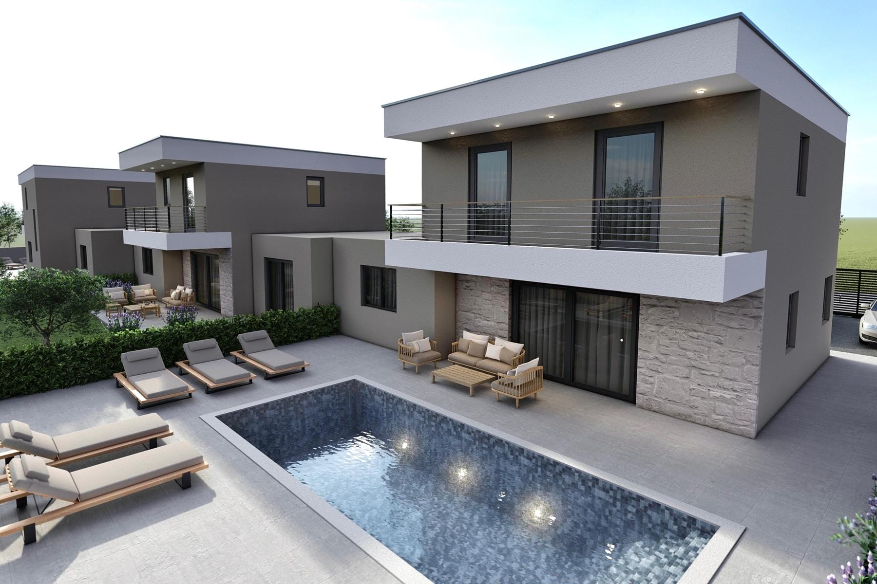 W niewielkiej miejscowości oddalonej o kilka kilometrów od urokliwego Porec znajduje się wyjątkowa nieruchomość oferująca komfort i spokój w malowniczym otoczeniu. Ta przestronna, nowocześnie zaprojektowana willa cechuje się funkcjonalnym układem pomieszczeń skierowanych na relaks i codzienne wygody. Właściciele mają do dyspozycji taras oraz prywatny basen, które tworzą doskonałe miejsce na wypoczynek na świeżym powietrzu.