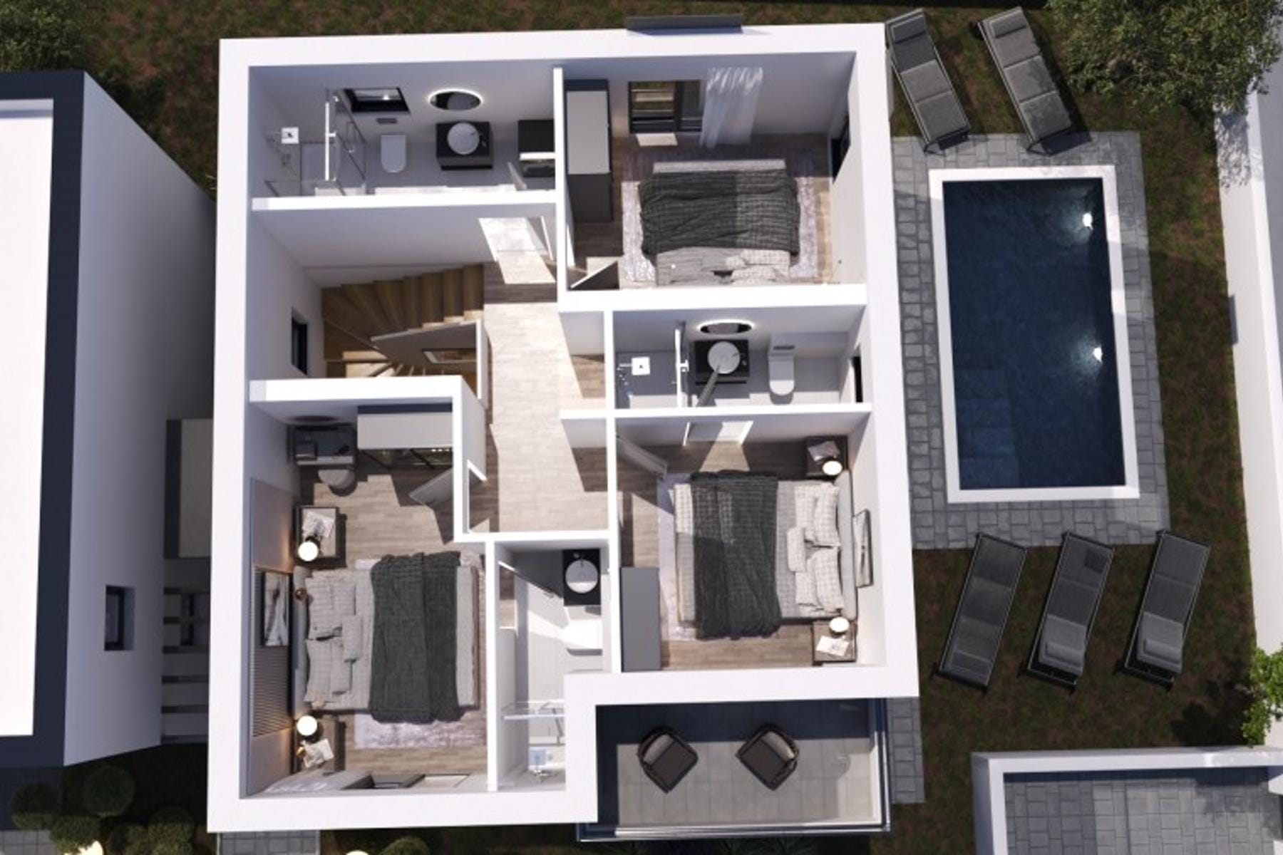 Przemyślany rozkład pomieszczeń łączy funkcjonalność z estetyką. Na parterze znajduje się przestronny salon z aneksem kuchennym oraz jedna sypialnia. Górna kondygnacja zawiera dodatkowe pokoje oraz łazienki, co czyni ofertę atrakcyjną dla rodziny lub osób poszukujących komfortowego domu wakacyjnego. Zielony teren wokół budynku pozwala na stworzenie ogrodu zgodnego z własnymi oczekiwaniami, a bliskość morza zachęca do aktywnego spędzania czasu.