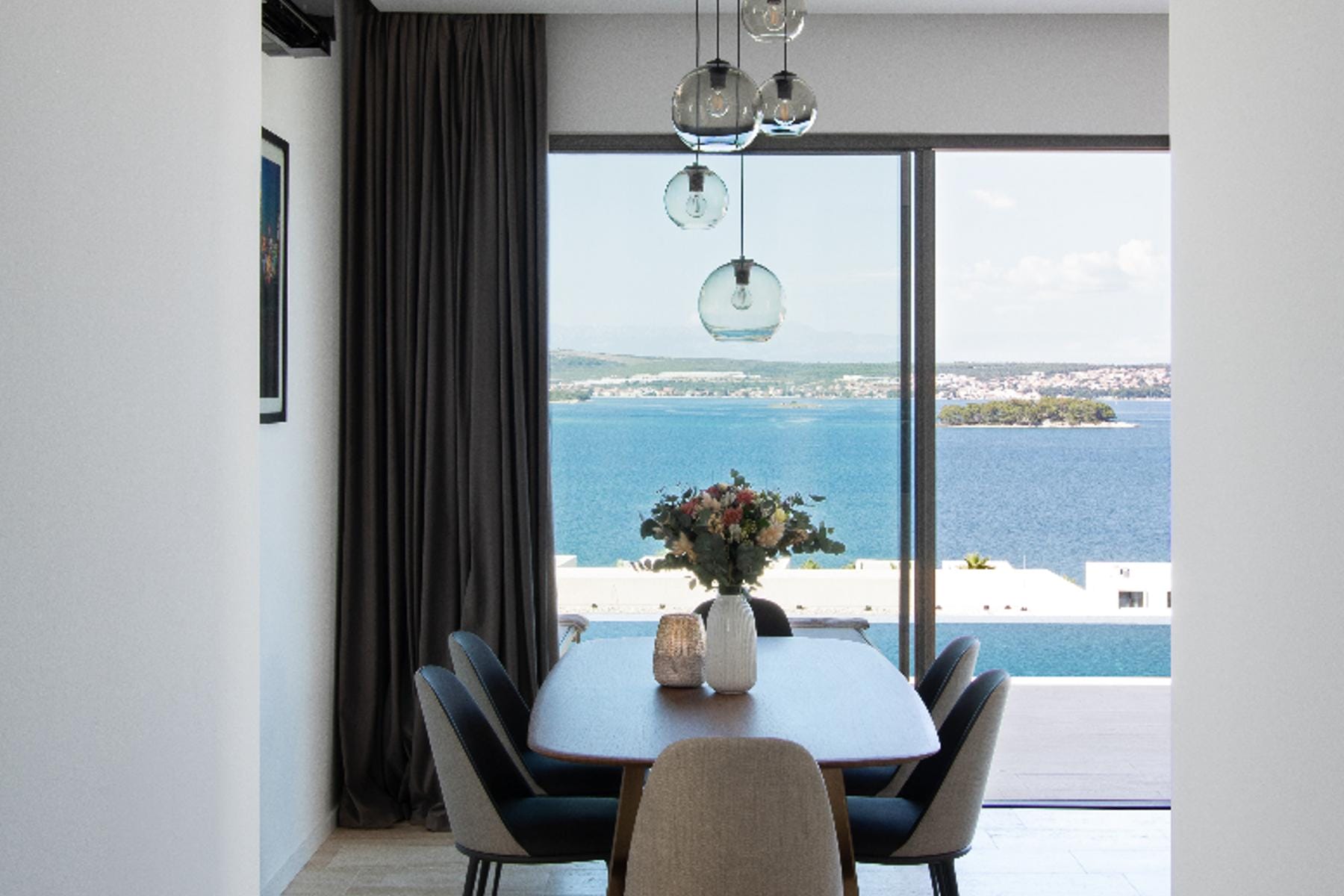 Dom został zaprojektowany z myślą o naturalnym świetle i otwartej przestrzeni. Przeszklone ściany doskonale eksponują widok na morze, a wyjście na taras prowadzi bezpośrednio do prywatnego basenu. Konstrukcja oraz materiały użyte przy budowie gwarantują trwałość i wygodę użytkowania.