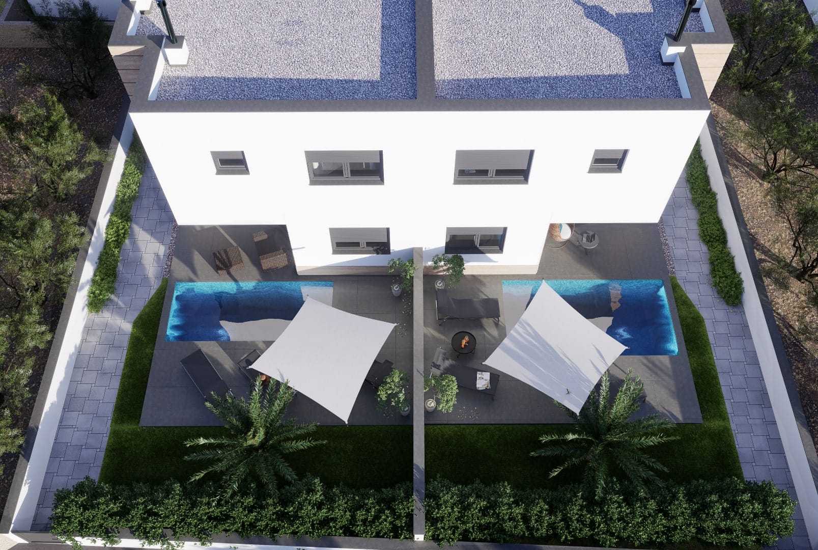 Wnętrze składa się z przestronnych pomieszczeń, zapewniających wygodę codziennego użytkowania. Na parterze znajduje się kuchnia połączona z jadalnią oraz salonem, które idealnie nadają się na spotkania z bliskimi. Zadaszony taras stanowi doskonałe miejsce do relaksu na świeżym powietrzu, a na pierwszym piętrze znajdują się trzy sypialnie, w tym jedna z prywatną łazienką. Całość uzupełnia basen o powierzchni 15 m2 oraz miejsca parkingowe, co sprawia, że oferta ta jest niezwykle atrakcyjna.
