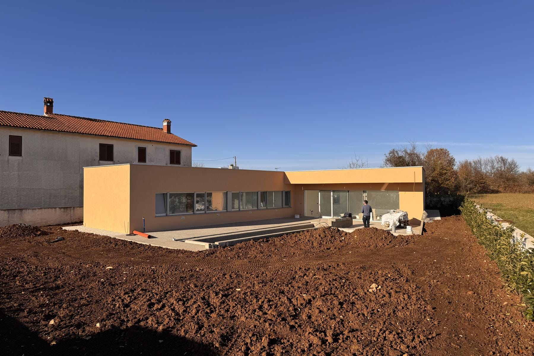 Ta nowoczesna nieruchomość znajduje się w spokojnej okolicy niedaleko Žminj, miejscowości o niepowtarzalnym uroku i bogatej historii. Dom został zaprojektowany z myślą o wygodzie i funkcjonalności, oferując dużo naturalnego światła dzięki układowi w kształcie litery L. Położony na dużej działce o powierzchni 1172 m², zapewnia komfort i swobodę użytkowania. Wnętrza łączą otwartą przestrzeń dzienną z kuchnią i jadalnią, co zachęca do wspólnego spędzania czasu. Komfort podnoszą trzy sypialnie, w tym przestrzeń dla gospodarzy z prywatną łazienką. Budynek cechuje wysoka jakość wykonania oraz przemyślane rozwiązania użytkowe, które spełnią oczekiwania nawet wymagających mieszkańców.