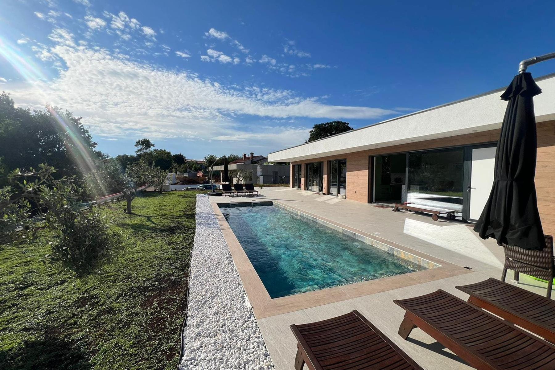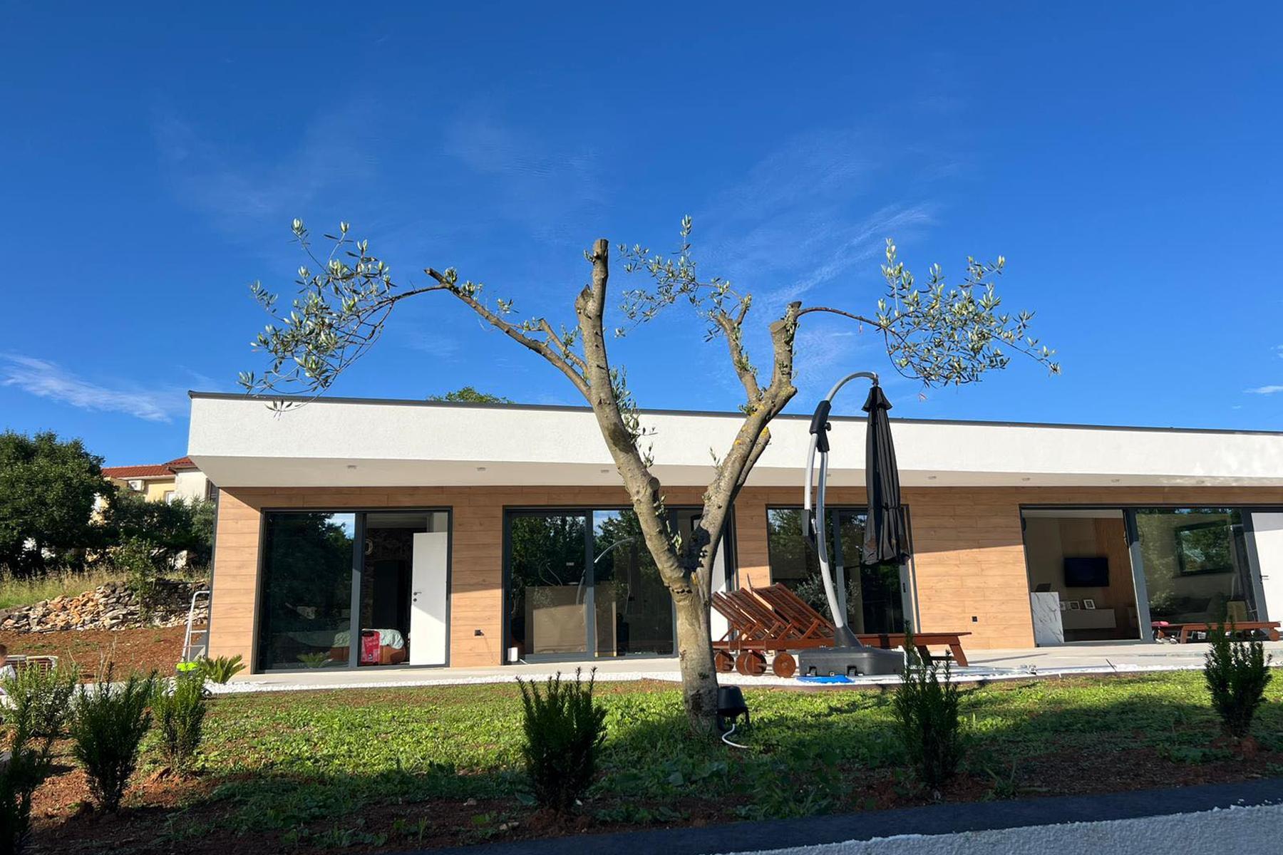 Przestronny, jednokondygnacyjny dom zlokalizowany jest tuż przy granicy terenu zabudowanego na obrzeżach malowniczego miasta Labin. Otacza go zieleń oraz niska zabudowa domów rodzinnych i domków wakacyjnych, co zapewnia spokój oraz prywatność. Nowoczesna architektura i wysoki standard wykonania czynią tę nieruchomość wyjątkową propozycją dla osób poszukujących komfortowego miejsca do zamieszkania lub odpoczynku. Powierzchnia domu pozwala na wygodne życie, oferując dwa niezależne lokale mieszkalne.
