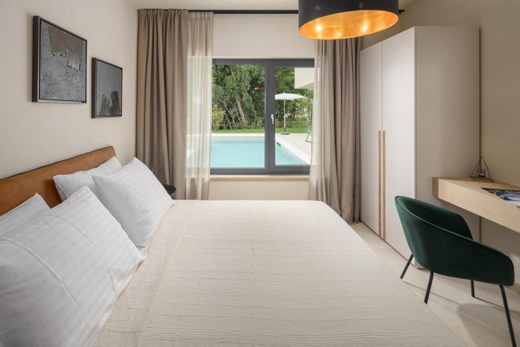 Ta luksusowa willa o powierzchni 190 m² znajduje się w pobliżu Porec, w spokojnej i ekskluzywnej dzielnicy. Otoczona jest starannie utrzymanym ogrodem o powierzchni 550 m², który zapewnia prywatność oraz wyjątkową przestrzeń do wypoczynku. Nowoczesna architektura budynku łączy funkcjonalność z estetyką, co pozwala na korzystanie z naturalnego światła przez cały dzień. Przestronne wnętrza oferują komfort i swobodę aranżacji. Duże przesuwne ściany aluminiowe prowadzą bezpośrednio na taras i basen, co stanowi idealne miejsce do relaksu i spotkań z rodziną lub znajomymi.