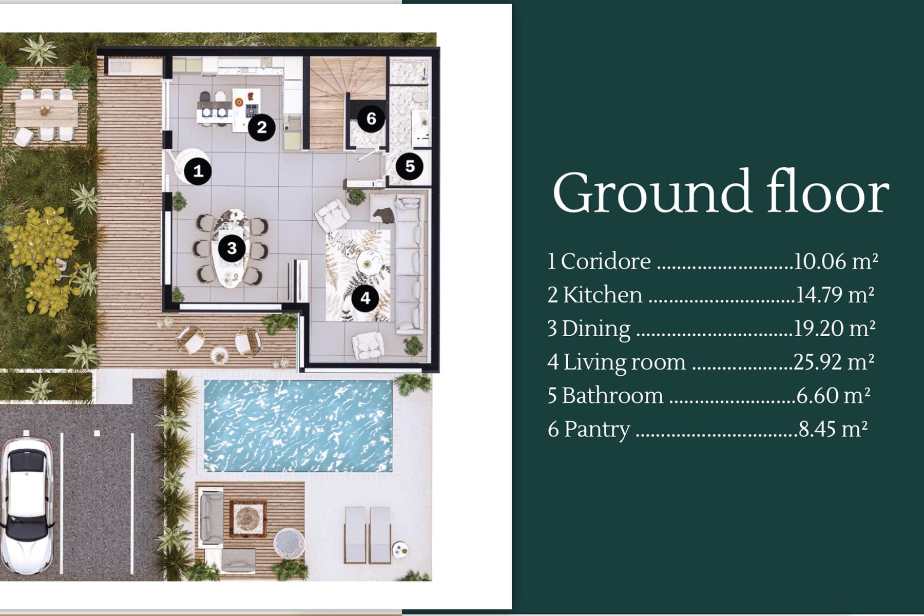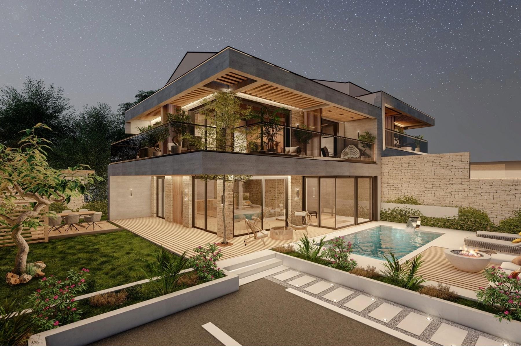 Wnętrza domu zaprojektowano z myślą o wygodzie mieszkańców. Duży salon oraz otwarta kuchnia z jadalnią tworzą wspólną przestrzeń do spotkań rodzinnych i przyjęć. Trzy komfortowe sypialnie wyposażone w prywatne tarasy umożliwiają relaks z pięknym widokiem i dostępem do świeżego powietrza. Trzy nowoczesne łazienki zapewniają wygodę dla całej rodziny i gości.