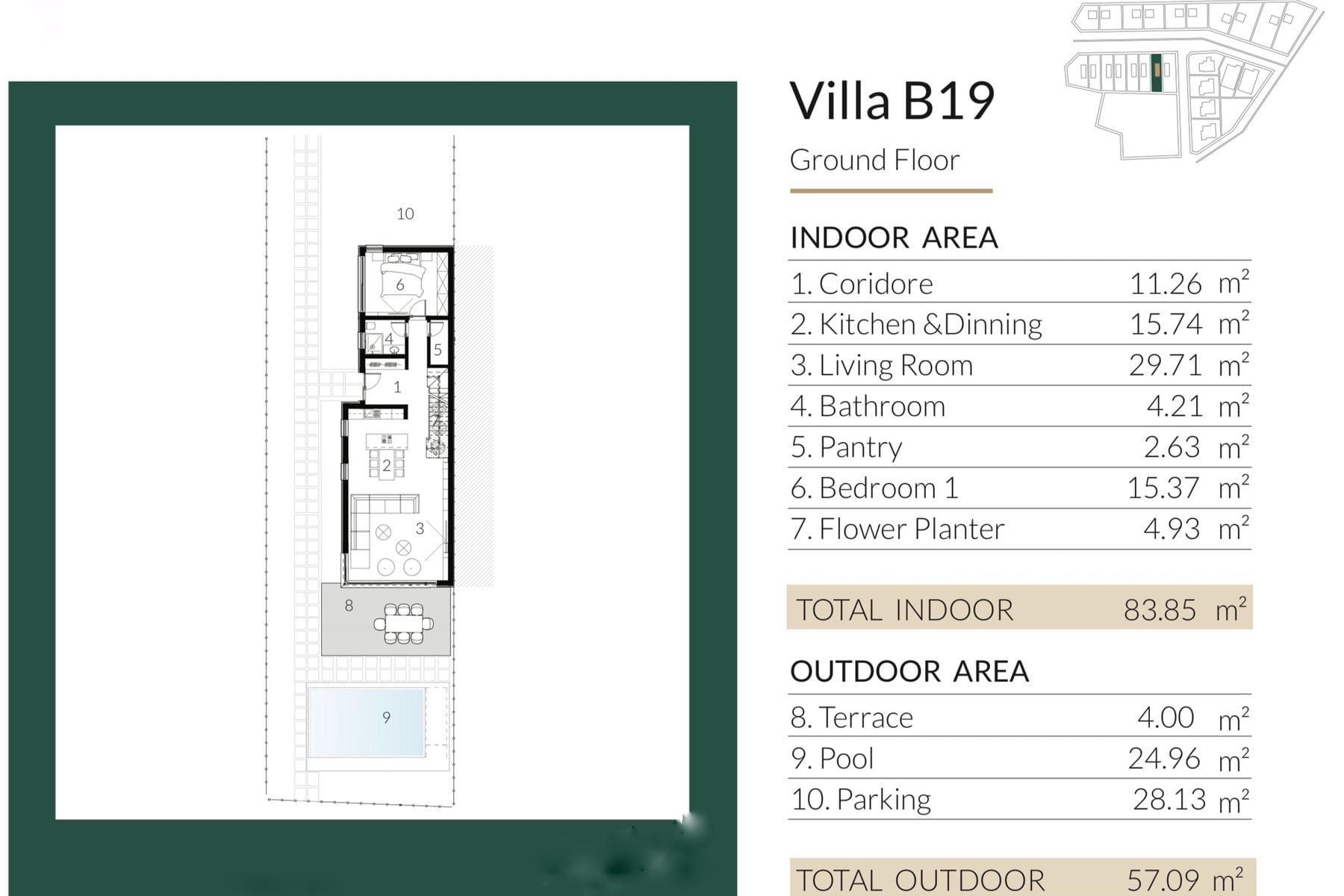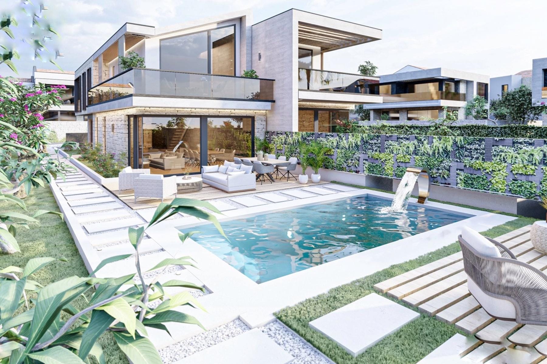 Obiekt charakteryzuje się nowoczesnym designem, zapewniając jednocześnie prywatność i wygodę. Główną część wnętrza stanowi duży salon, idealny do rodzinnych spotkań lub przyjmowania gości. Kuchnia wraz z przestronną jadalnią to przestrzeń, która zachęca do tworzenia wyjątkowych posiłków. Trzy sypialnie posiadają dostęp do tarasów, co umożliwia relaks z widokiem na zielone otoczenie.