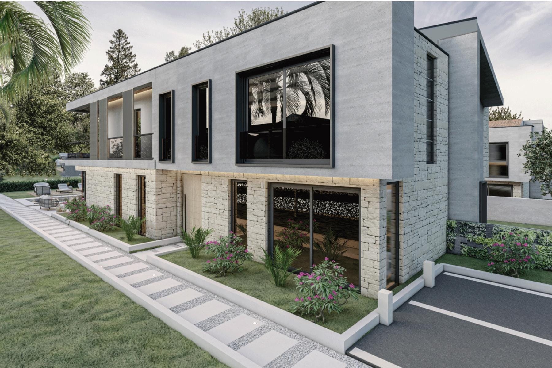 Trzy przestronne sypialnie wyposażone w indywidualne tarasy umożliwiają komfortowy wypoczynek. Liczne łazienki zapewniają wygodę dla mieszkańców oraz gości. Wszystko to znajduje się na działce o powierzchni 314 metrów kwadratowych, która pozwala na swobodne korzystanie z przestrzeni zewnętrznej, idealnej do uprawiania ogrodnictwa lub rekreacji na świeżym powietrzu.