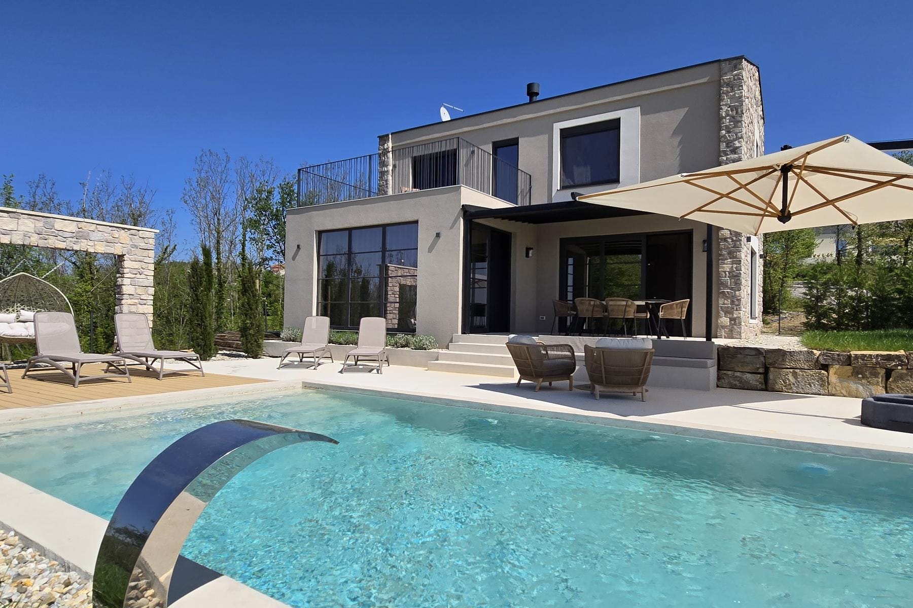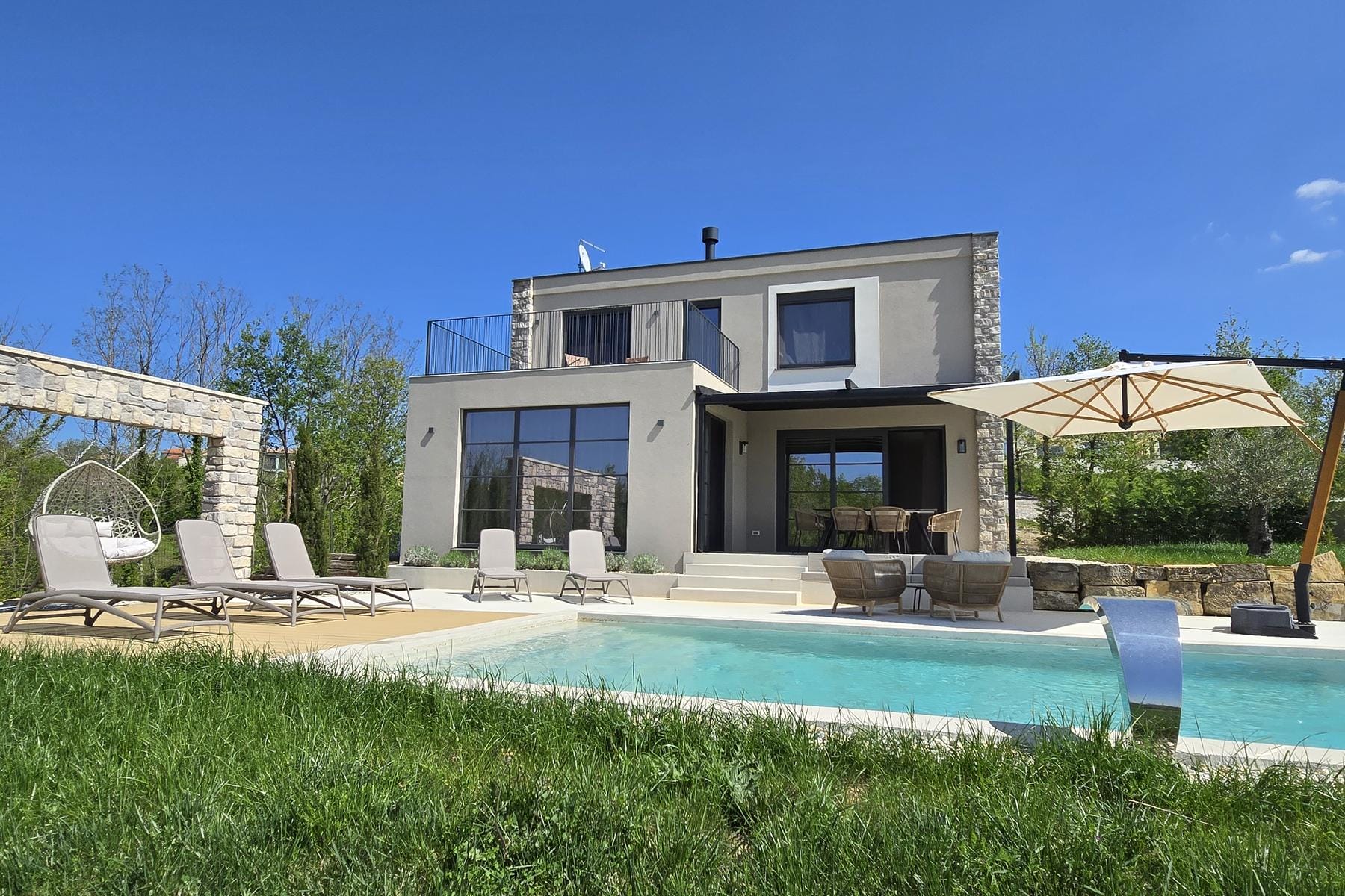 Willa położona jest w niewielkiej odległości od malowniczego Motovun. Znajduje się na podwyższeniu, co zapewnia rozległy i niezakłócony widok na miasto, zielone tereny oraz morze. Budynek wyróżnia się nowoczesnym designem oraz solidnym wykonaniem z kamienia, który harmonijnie wpisuje się w otoczenie. Powierzchnia całkowita wynosi 198 m², a przestrzeń mieszkalna to 137 m². Willa posiada również tarasy o powierzchni 36 m², z których jeden jest wyposażony w ruchomy dach – idealne miejsce do relaksu niezależnie od pogody.