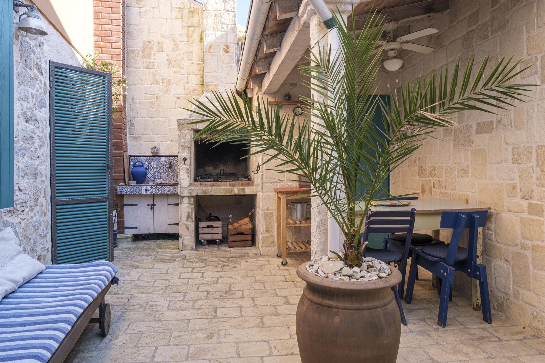 Zewnętrzna część nieruchomości to urokliwy dziedziniec otoczony kamiennym murem, który gwarantuje prywatność i spokój. Tradycyjny grill oraz altana tworzą idealne miejsce do organizowania letnich spotkań na świeżym powietrzu. Fasada domu zdobi połączenie naturalnego kamienia z turkusowymi okiennicami i drzwiami, co podkreśla charakter dalmatyńskiej architektury.