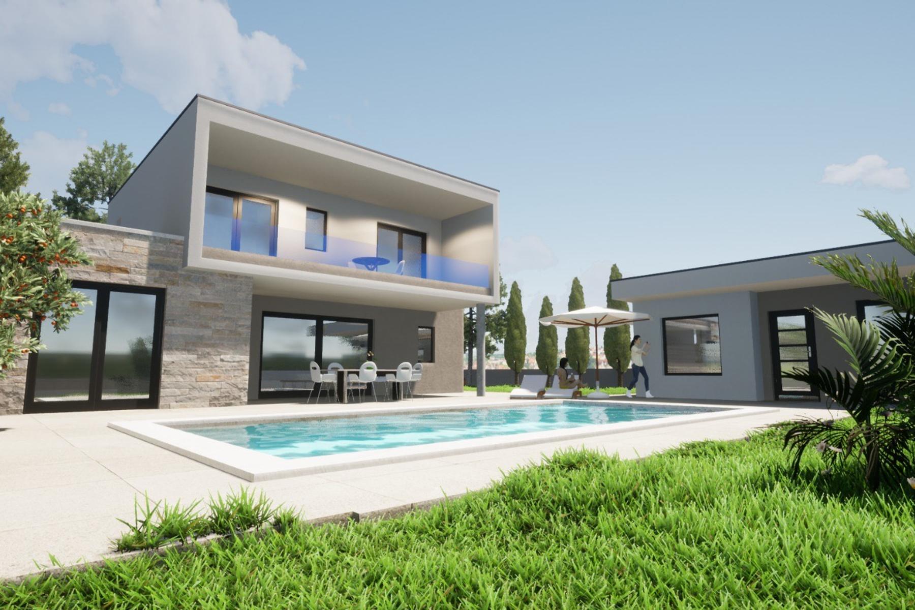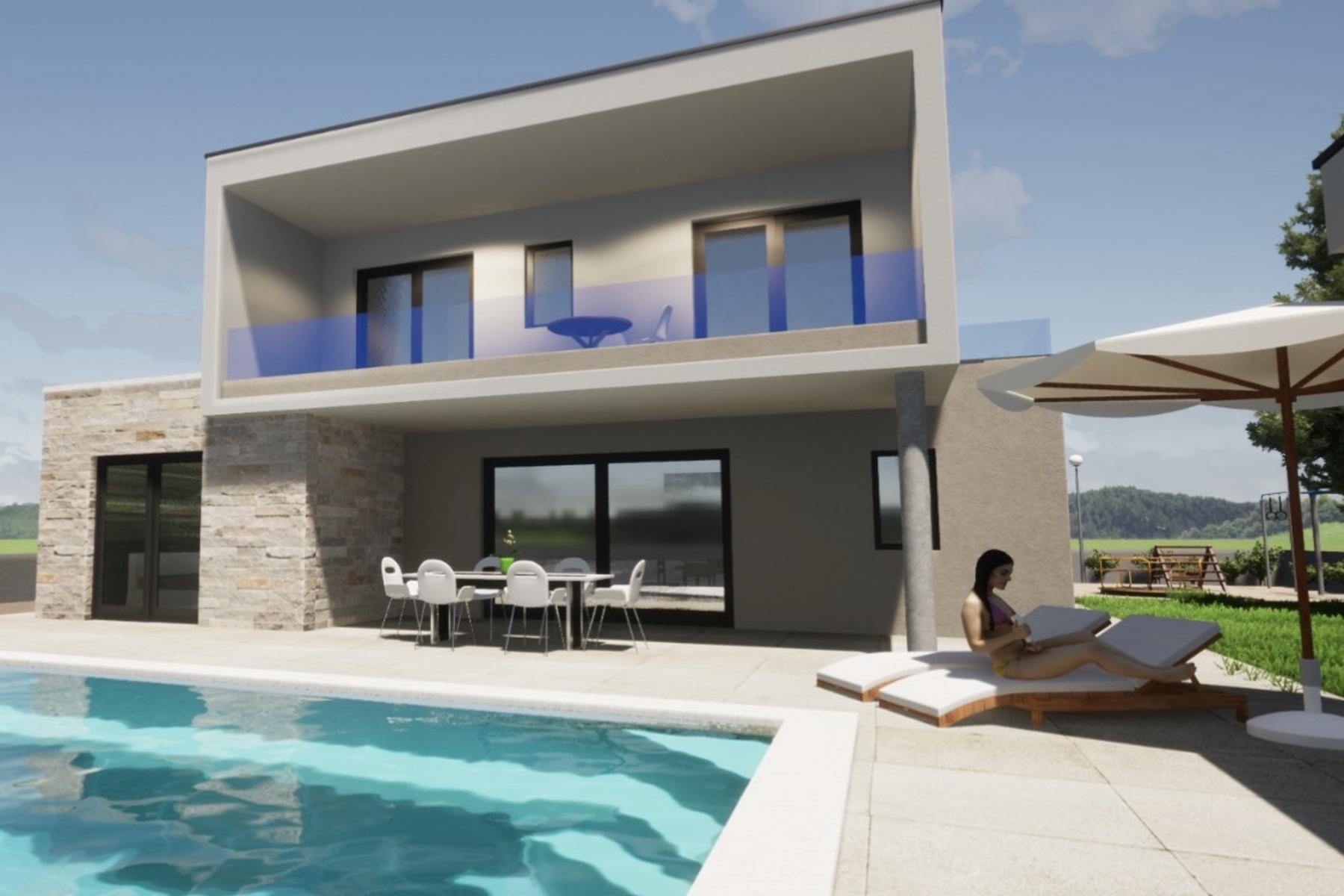 Właśnie zakończone prace budowlane w Raštane Górne pozwoliły na powstanie unikalnego, nowoczesnego domu, usytuowanego na przestronnej działce o powierzchni ponad tysiąca metrów kwadratowych. Ta nieruchomość znakomicie wpisuje się w naturalne otoczenie, otaczając się bujną roślinnością i starannie zaprojektowanym ogrodem, który pozwala na relaks w ciszy i spokoju. Budynek rozciąga się na dwóch kondygnacjach, oferując funkcjonalny i przestronny układ wnętrz dostosowany do wymagających oczekiwań.