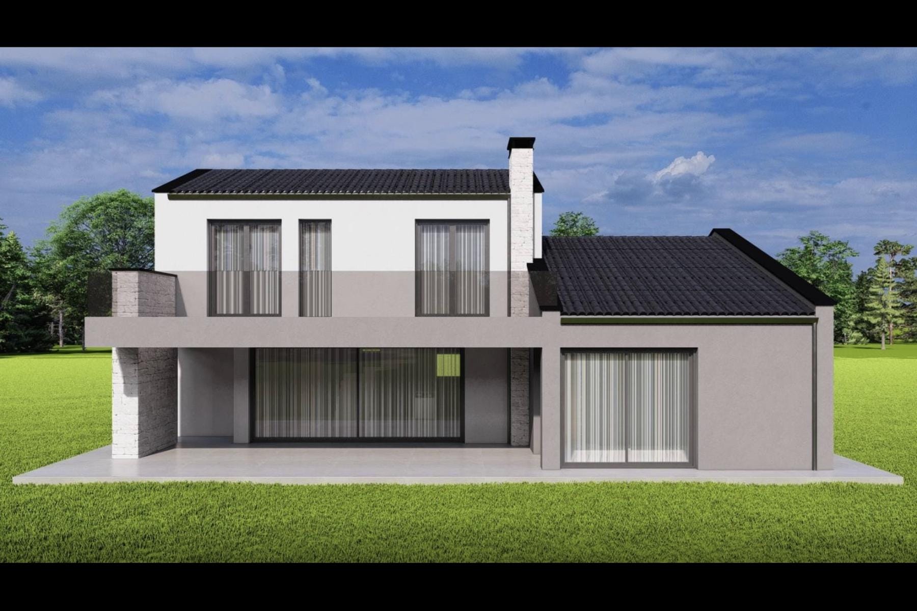 Parter zajmuje przestronny salon połączony z jadalnią i kuchnią, które tworzą optymalne miejsce do wspólnego spędzania czasu. Dodatkowo usytuowano dwie sypialnie oraz dwie łazienki o wysokim standardzie. Pomieszczenie techniczne umożliwia łatwą organizację przestrzeni gospodarczej. Na pierwszym piętrze zaplanowano dwie sypialnie oraz kolejną łazienkę, co sprawia, że dom jest wygodny również dla większej rodziny lub gości.