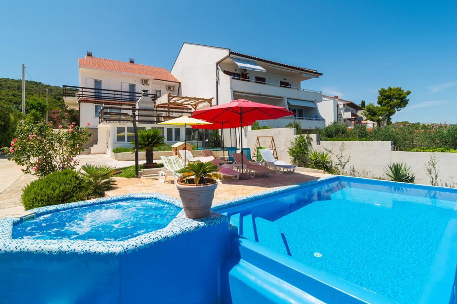 Otoczenie domu tworzy prywatną oazę. Basen z miejscem do opalania, jacuzzi i komfortowa infrastruktura w ogrodzie sprzyjają odpoczynkowi z rodziną i przyjaciółmi. Nieruchomość spełni oczekiwania osób poszukujących wysokiej jakości życia w atrakcyjnej lokalizacji nad wybrzeżem Adriatyku.