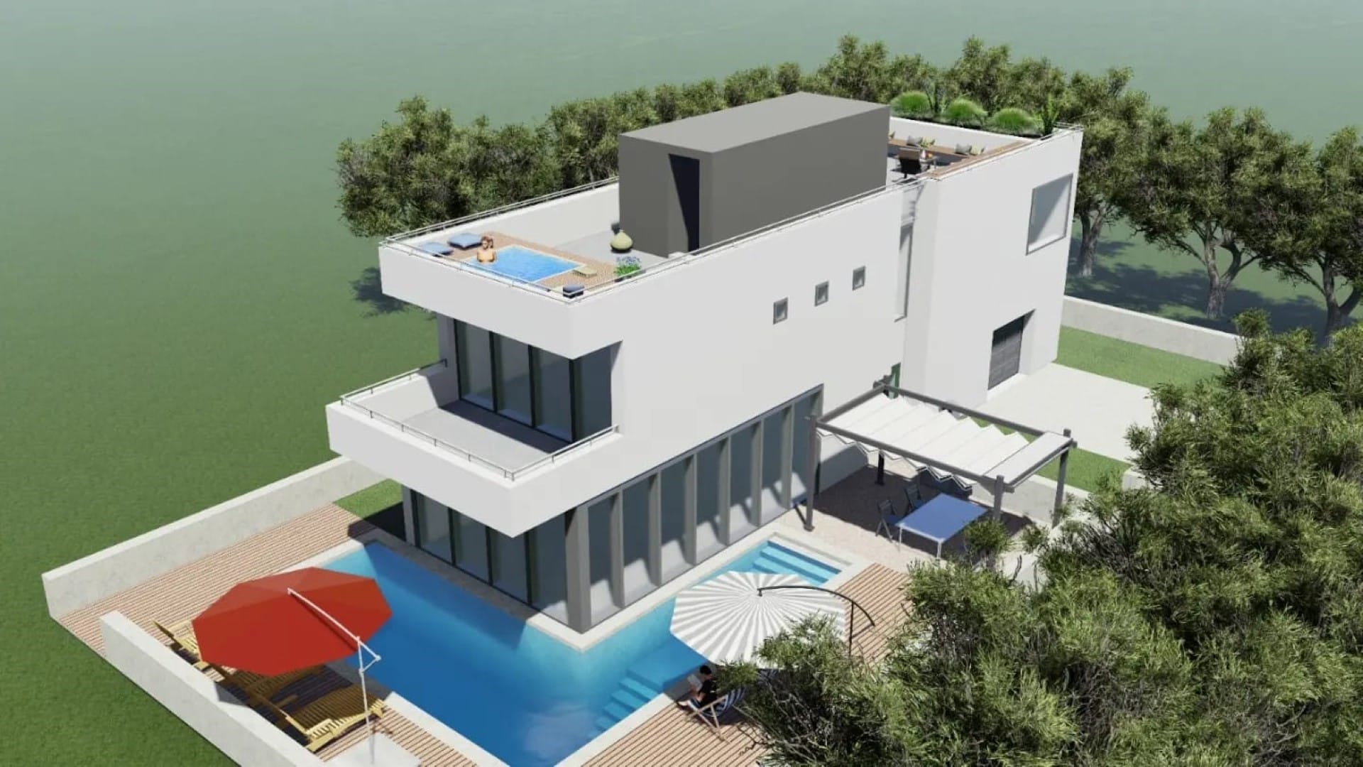 Dom zaplanowano z dbałością o najdrobniejsze szczegóły, aby spełniał oczekiwania nawet najbardziej wymagających klientów. Cechą wyróżniającą nieruchomość jest taras na dachu, który oferuje wspaniałe widoki na okolicę i morze. Przestronny basen to idealne miejsce na relaks w ciepłe, słoneczne dni.