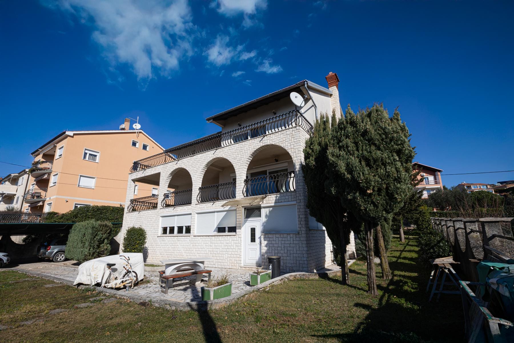 Prezentowana nieruchomość to wyjątkowy dom położony w spokojnej części miasta Rijeka, słynącego z pięknych widoków i korzystnego klimatu. Budynek o powierzchni aż 551 m² rozpościera się na czterech kondygnacjach, które oferują trzy niezależne mieszkania. Każde z nich ma osobne wejście, co daje szerokie możliwości aranżacyjne, zarówno dla rodziny, jak i inwestorów szukających atrakcyjnych lokali pod wynajem.