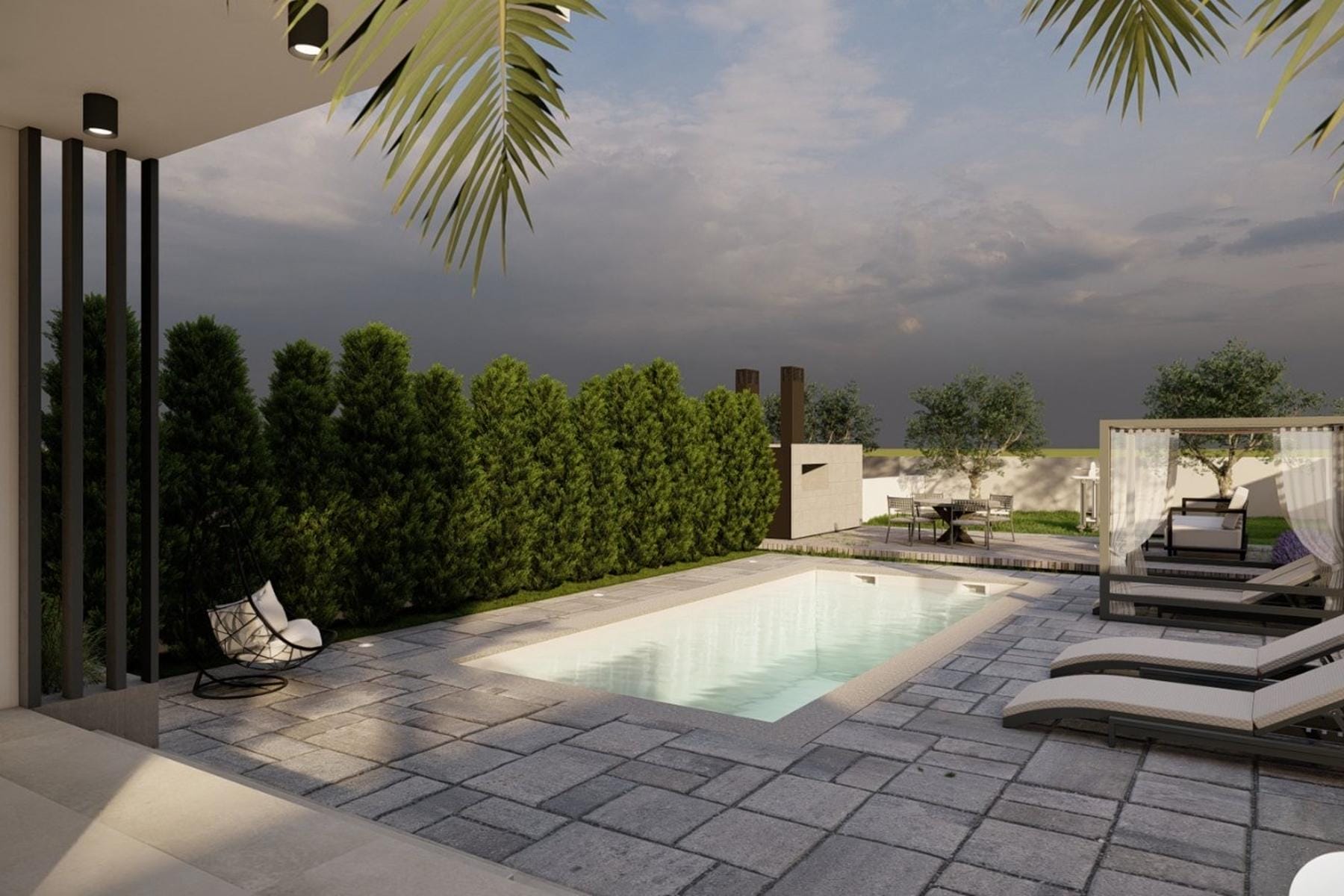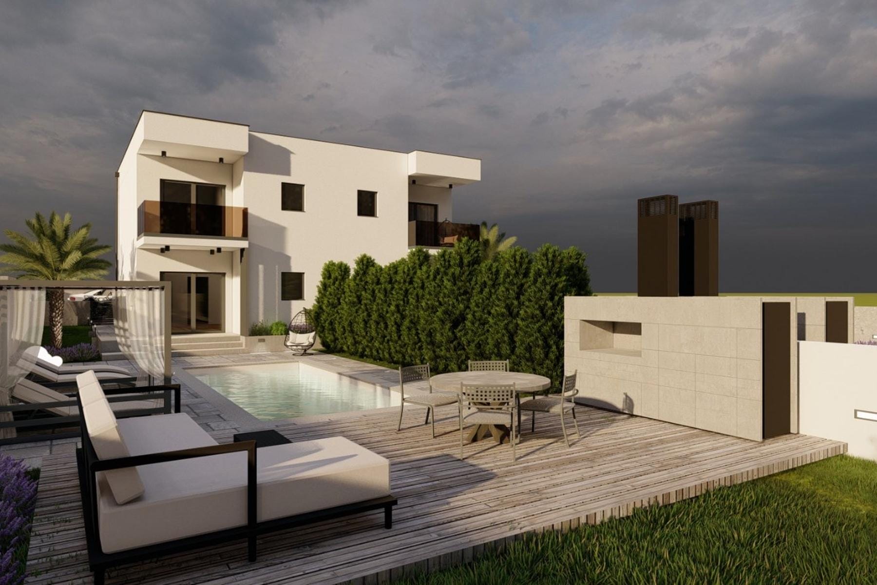 Na parterze znajduje się elegancka strefa dzienna z dużym salonem i kuchnią, z której można wygodnie wyjść na taras i dalszą część ogrodu. Do nieruchomości przynależy także toaleta, a w projekcie przewidziano możliwość dobudowy prywatnego basenu, co może uczynić tę ofertę jeszcze bardziej wyjątkową. Bliskość morza i otoczenie nowoczesnych willi tworzą unikalne miejsce do wypoczynku przez cały rok.