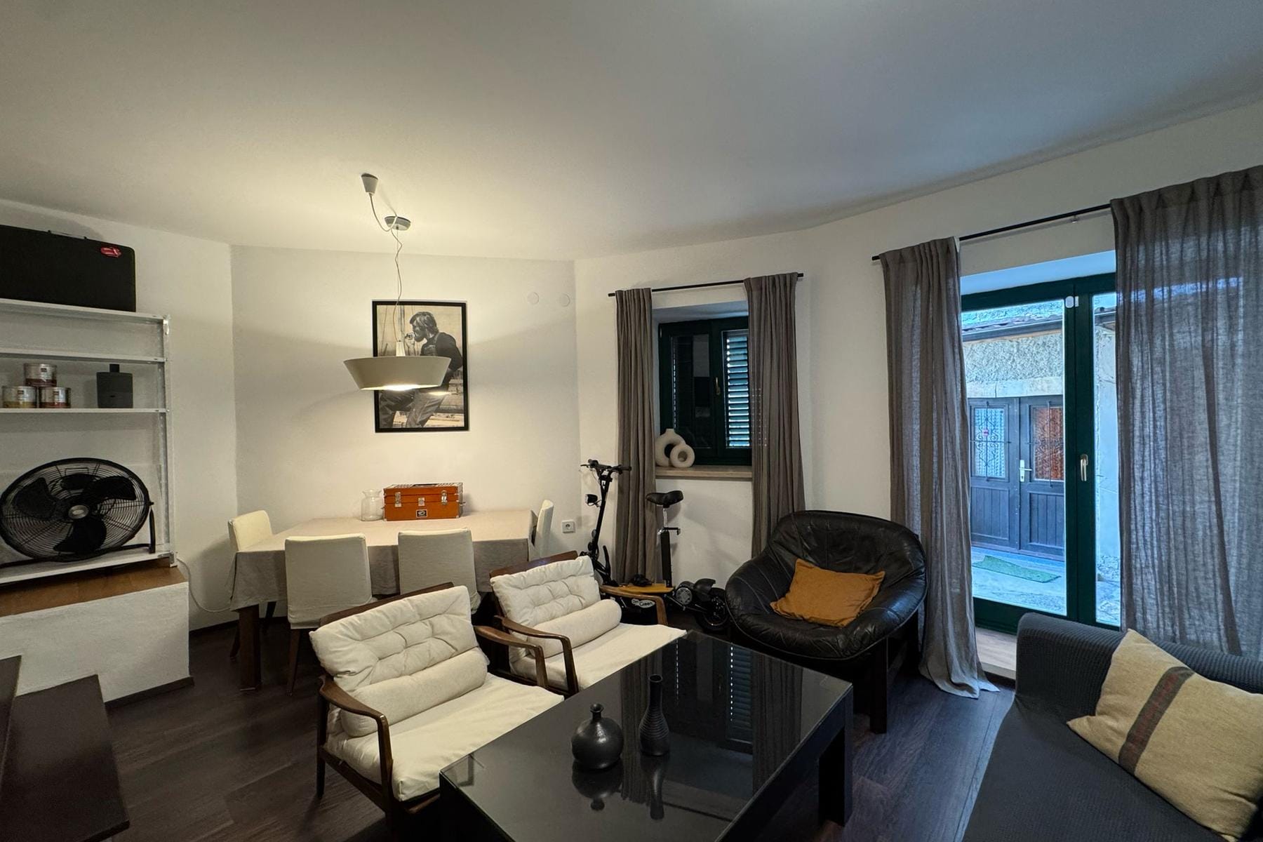 Na parterze znajduje się przestronny salon z wyjściem na wspólny dziedziniec, łazienka oraz pomieszczenie gospodarcze. Kuchnia połączona z jadalnią mieści się na piętrze, co tworzy wygodne miejsce do codziennego gotowania i spożywania posiłków. Dom jest gotowy do zamieszkania, a jego kamienna konstrukcja nadaje mu niepowtarzalny charakter i trwałość.
