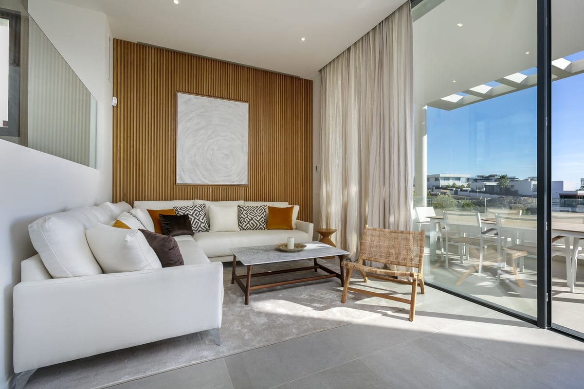 Każda sypialnia ma własną łazienkę, co zwiększa komfort użytkowników. Na parterze znajdują się dwie sypialnie z dużymi kabinami prysznicowymi, które dziewią wszystko, czego potrzeba. W przestronnym salonie, przeszklone ściany zapewniają doskonałe doświetlenie wnętrza, a kuchnia została wyposażona w nowoczesne urządzenia marki Bosch. Gospodarstwo domowe jest zintegrowane z systemem domotyki, co zwiększa wygodę codziennego życia. Na najwyższym piętrze znajduje się przestronna główna łazienka z wolnostojącą wanną, z której rozpościera się panoramiczny widok. Do utrzymania ogrodu oraz basenu czyni współpraca z sąsiadami w ramach społeczności zestawieniem przyjemności bezpieczeństwa.