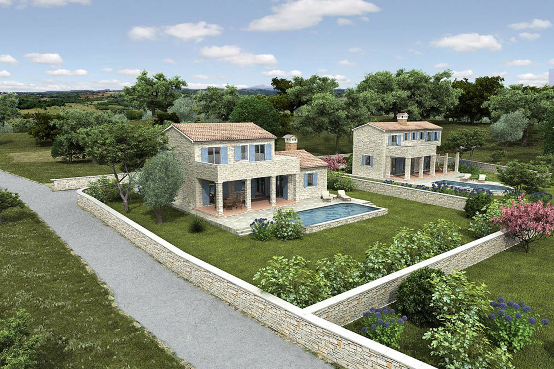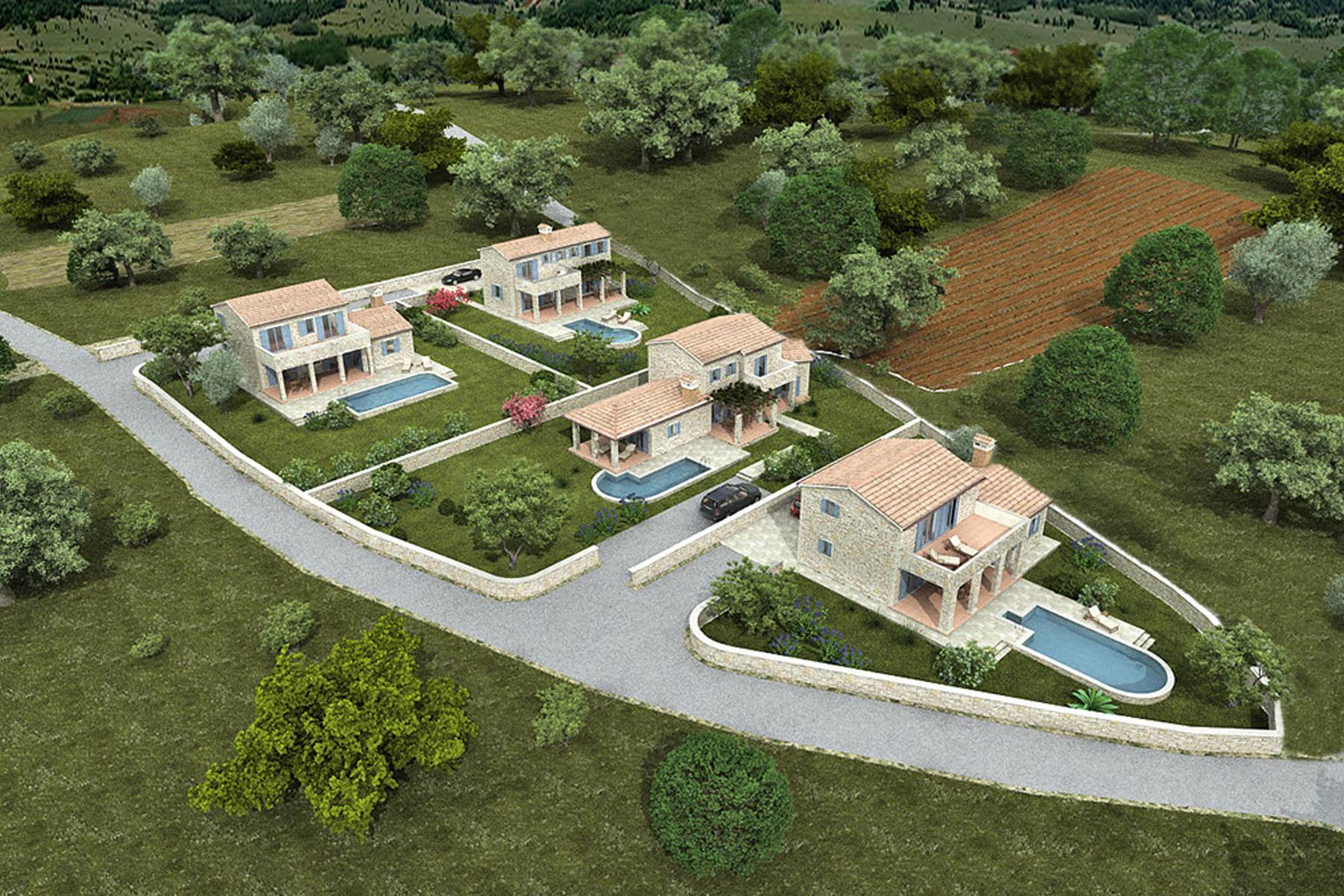 Projekt przewiduje wybudowanie kamiennych willi osadzonych wśród naturalnej roślinności. Wokół zachowano sporo przestrzeni zielonej, co gwarantuje komfort i prywatność. Nieruchomość położona jest w odległości zaledwie 250 metrów od niewielkiego centrum miejskiego, gdzie funkcjonują liczne restauracje, sklepy i kawiarnie.