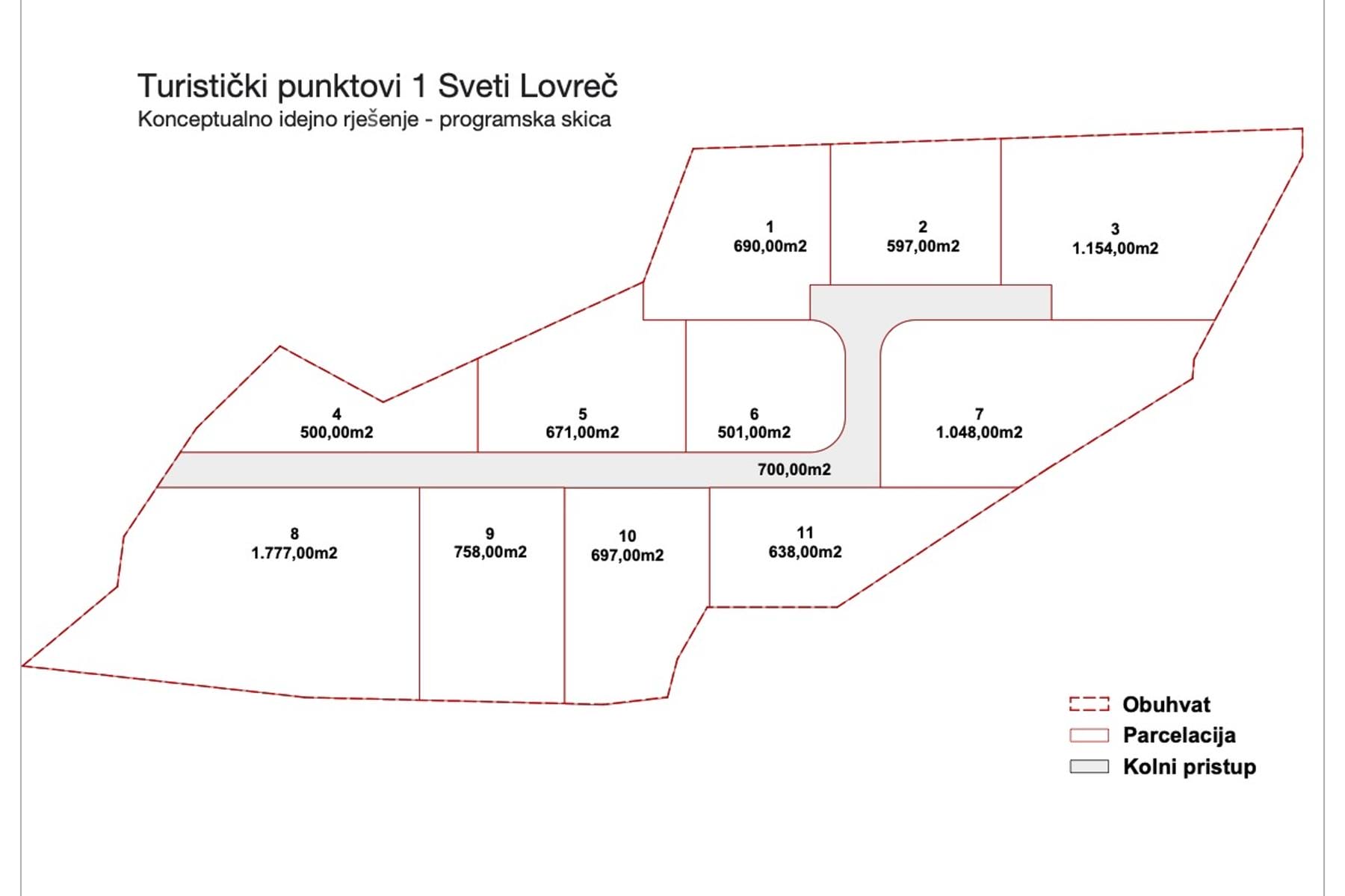 Proponowana nieruchomość to rozległy teren rolny o powierzchni 9731 m², położony w spokojnej miejscowości Sveti Lovreč na półwyspie Istria w Chorwacji. Ta przestrzeń zapewnia możliwość realizacji różnorodnych celów rolniczych lub inwestycyjnych, wpisując się w naturalny krajobraz otoczenia. Teren znajduje się na granicy kilku działek geodezyjnych, które zostały połączone w jedną całość, co znacznie ułatwia gospodarowanie przestrzenią.