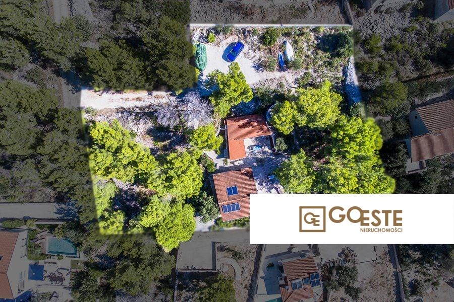 Sprzedawana nieruchomość zajmuje powierzchnię 2000 m2, w tym dwa domy, które tworzą harmonijną całość. Położenie na lekkim wzniesieniu gwarantuje atrakcyjne panoramiczne widoki na okoliczne morze oraz wyspy Hvar i Vis. W skład większego domu wchodzą: