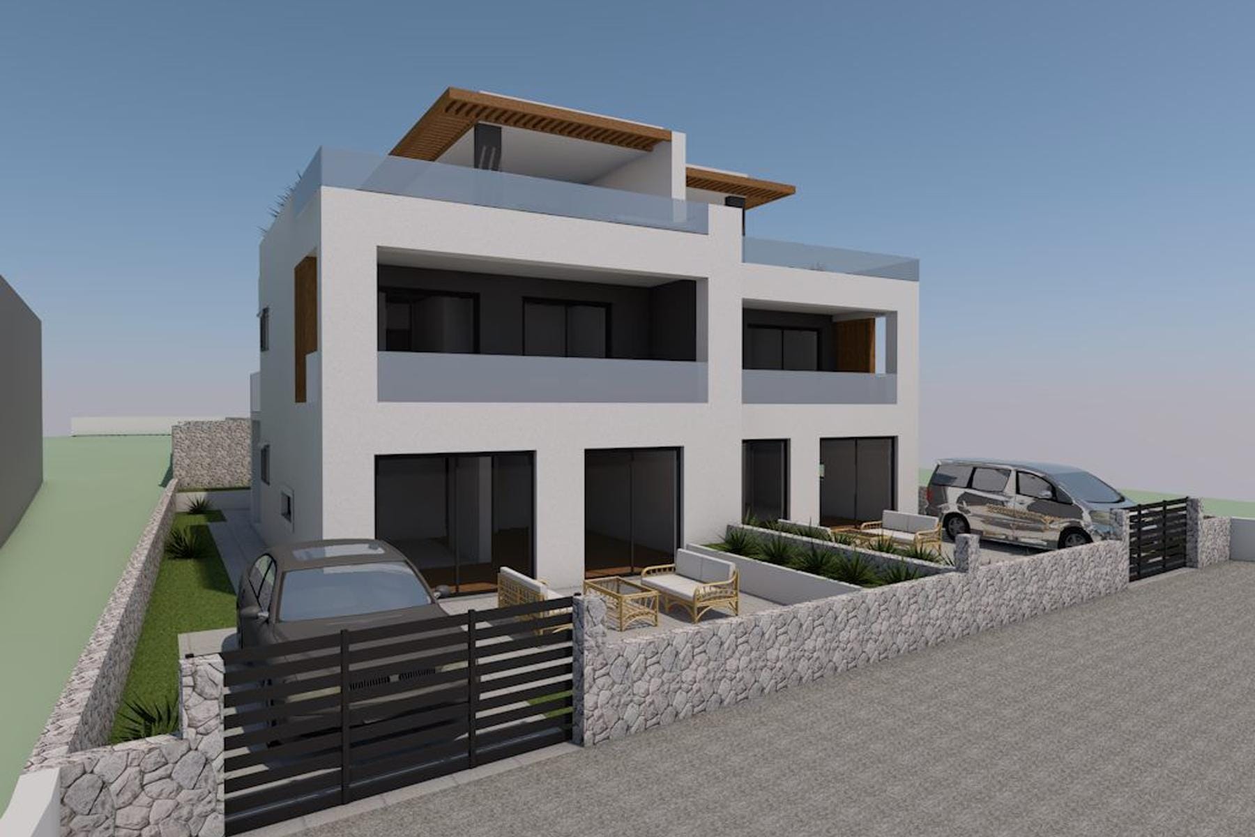 Przestronność i funkcjonalność to cechy charakterystyczne nieruchomości położonej w urokliwym Tribunj. Zaprojektowana jako segment bliźniaczy, rozciąga się na łącznej powierzchni użytkowej ok. 175 m² netto, rozmieszczonej na czterech kondygnacjach. Poniżej znajduje się podsumowanie najważniejszych cech tego domu.