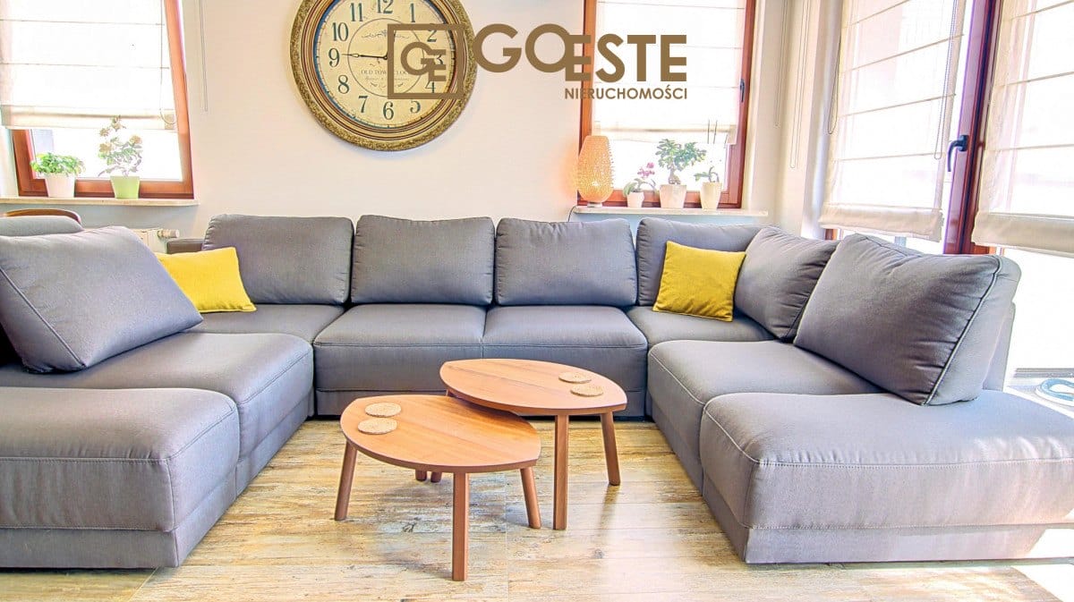 Wnętrze zaprojektowane zostało z myślą o wygodzie i estetyce. W salonie dominuje duża rozkładana sofa marki EtapSofa, a całość wzbogacona jest o domowy system kinowy z projektorem i nagłośnieniem firmy Bose, który pozwala cieszyć się filmami w zaciszu własnego mieszkania.
