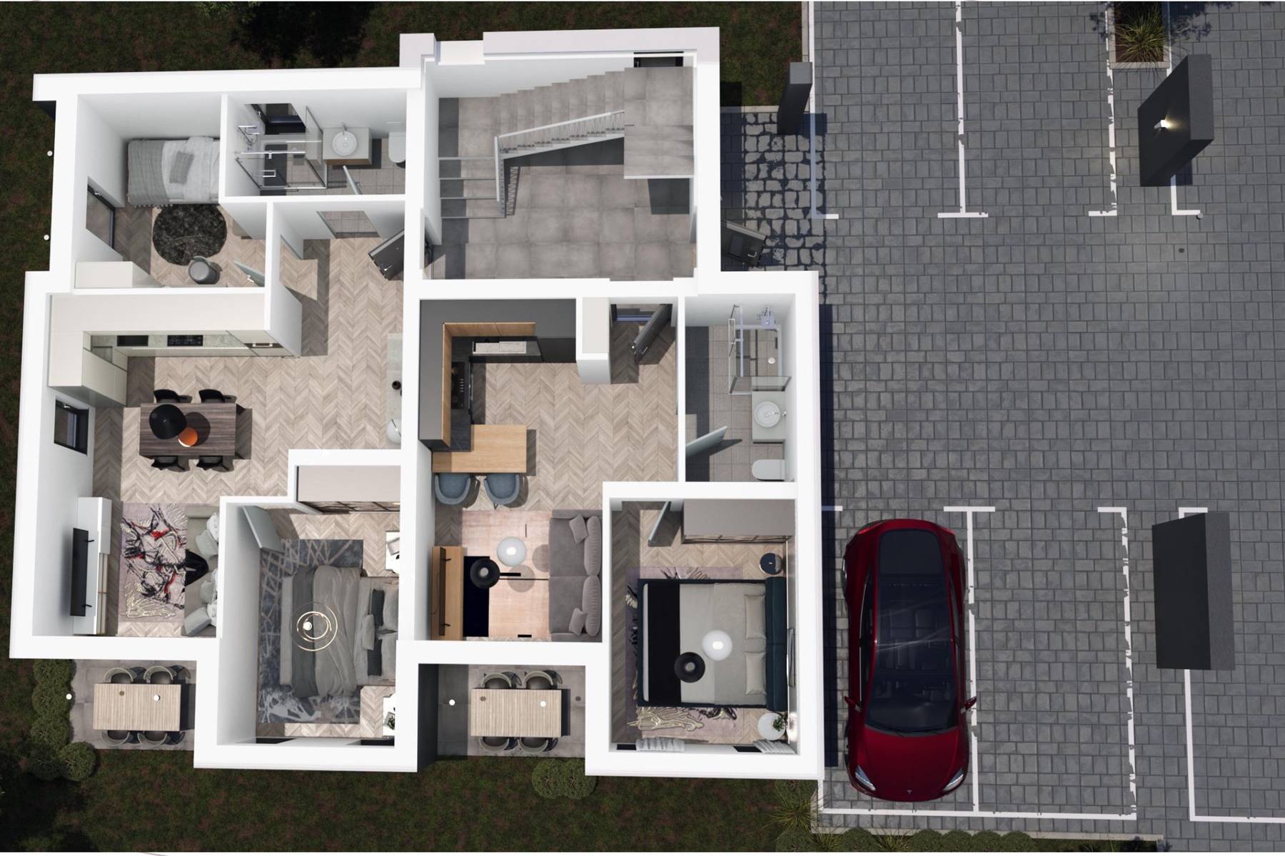 Trzy sypialnie zapewniają niezbędną prywatność i komfort dla mieszkańców. Dwie łazienki umożliwiają wygodne korzystanie z przestrzeni nawet większej grupie osób. Otwarta przestrzeń dzienna łączy salon z kuchnią i jadalnią, co sprzyja integracji i daje poczucie przestronności.