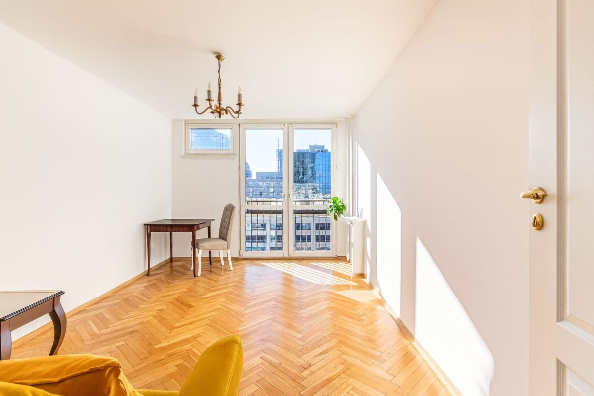 Wnętrze mieszkania zaprojektowano z myślą o funkcjonalności i komforcie. Dzięki brakowi pomieszczeń przechodnich, przestrzeń jest maksymalnie wykorzystana, a układ zapewnia prywatność każdemu z domowników. W mieszkaniu zachował się oryginalny parkiet z dębowej deski, który nadaje wnętrzu ciepła i elegancji. Kuchnia z osobnym wejściem pozwala na swobodne gotowanie bez zakłócania strefy dziennej. Z wysokości 14. piętra rozpościera się niepowtarzalny widok na tętniącą życiem Warszawę – zarówno w dzień, jak i po zmroku. Ekspozycja zachodnia gwarantuje dużo światła i słoneczne popołudnia.