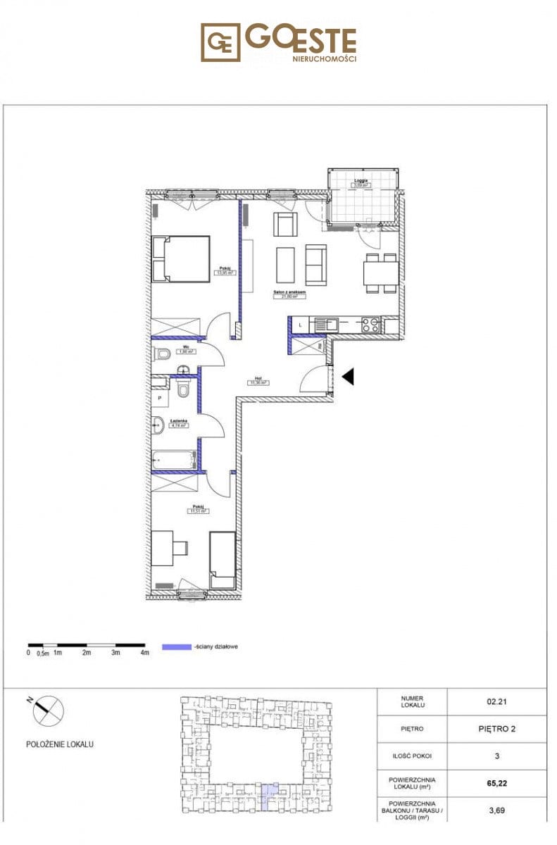 Mieszkanie 3 pokojowe o powierzchni 65,22 m2 znajduje się na 2 pietrze w budynku 4 piętrowym z windą.