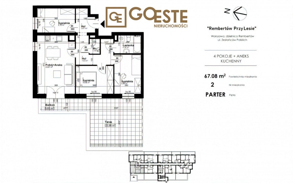 Agencja GOESTE Nieruchomości ma przyjemność zaprezentować 4-pokojowe mieszkanie o powierzchni 67,08 m2 w stanie deweloperskim, położone na parterze nowoczesnego bloku przy ul. Zesłańców Polskich 8, na osiedlu Przy Lesie w Rembertowie. Mieszkanie to stanowi doskonały wybór dla osób szukających spokoju i bliskości natury, bez rezygnacji z łatwego dostępu do infrastruktury miejskiej.