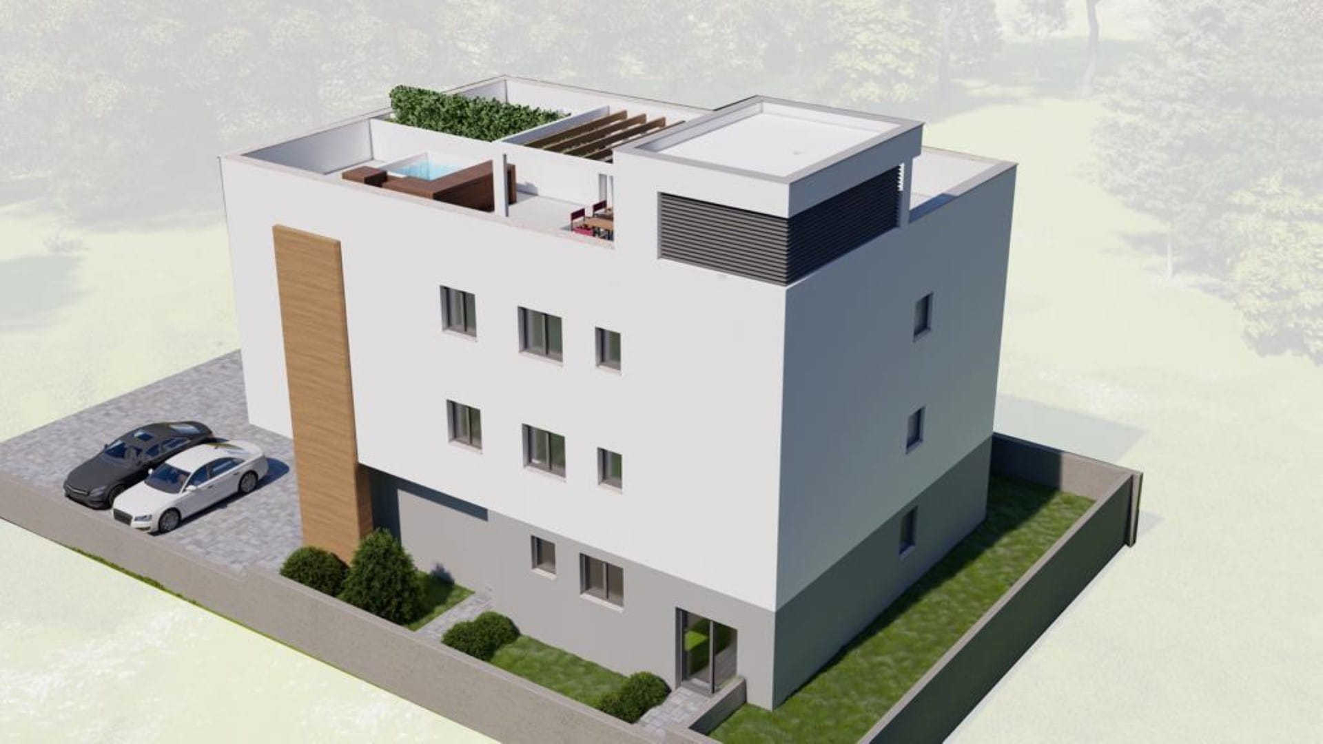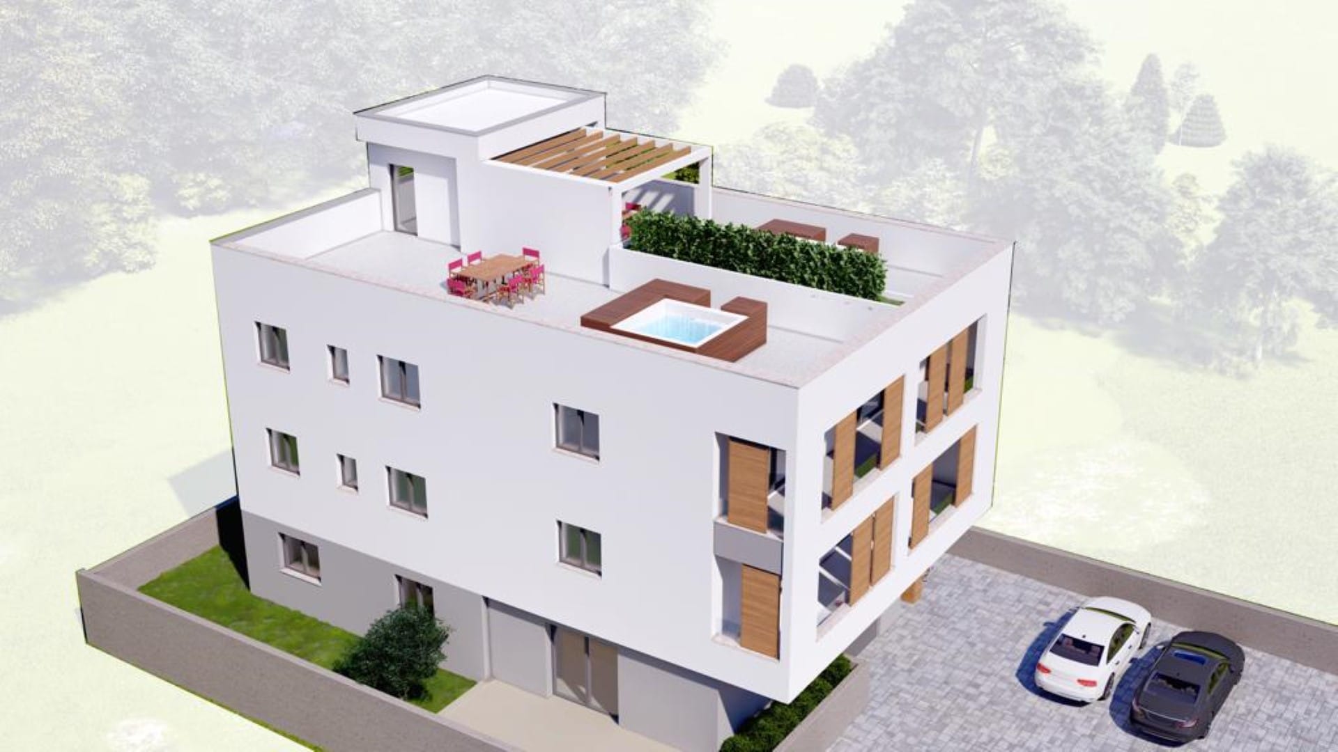 Warto zwrócić uwagę na jego dodatkowe atuty, takie jak piękny taras na dachu, idealny do organizacji spotkań w gronie najbliższych. Dodatkowo, dla wygody mieszkańców zaplanowano dwa zewnętrzne miejsca parkingowe oraz pomieszczenie gospodarcze. Budynek wznoszony jest w technologii termobloków, co zapewnia doskonałe ocieplenie. Zastosowanie trójwarstwowego parkietu z naturalnego dębu oraz okien PCV wzbogaca estetykę wnętrza. Zainstalowane elektryczne ogrzewanie podłogowe współpracuje z nowoczesnymi pompami ciepła, gwarantując komfort w chłodniejsze dni. Każdy pokój został wyposażony w niezależny system klimatyzacji, co zwiększa wygodę użytkowania.