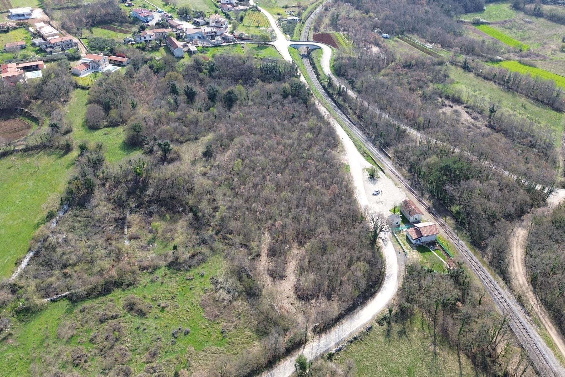 Oferowana nieruchomość to działka, której powierzchnia przekracza 2500 m², położona w pobliżu osady Pifari w gminie Žminj. Część działki, wynosząca około 800 m², znajduje się w obszarze przeznaczonym pod zabudowę mieszkaniową, co daje realną szansę na budowę domu lub wielu budynków rekreacyjnych. Całość terenu ukształtowana jest nieregularnie, co umożliwia kreatywne planowanie zabudowy oraz ogrodów.