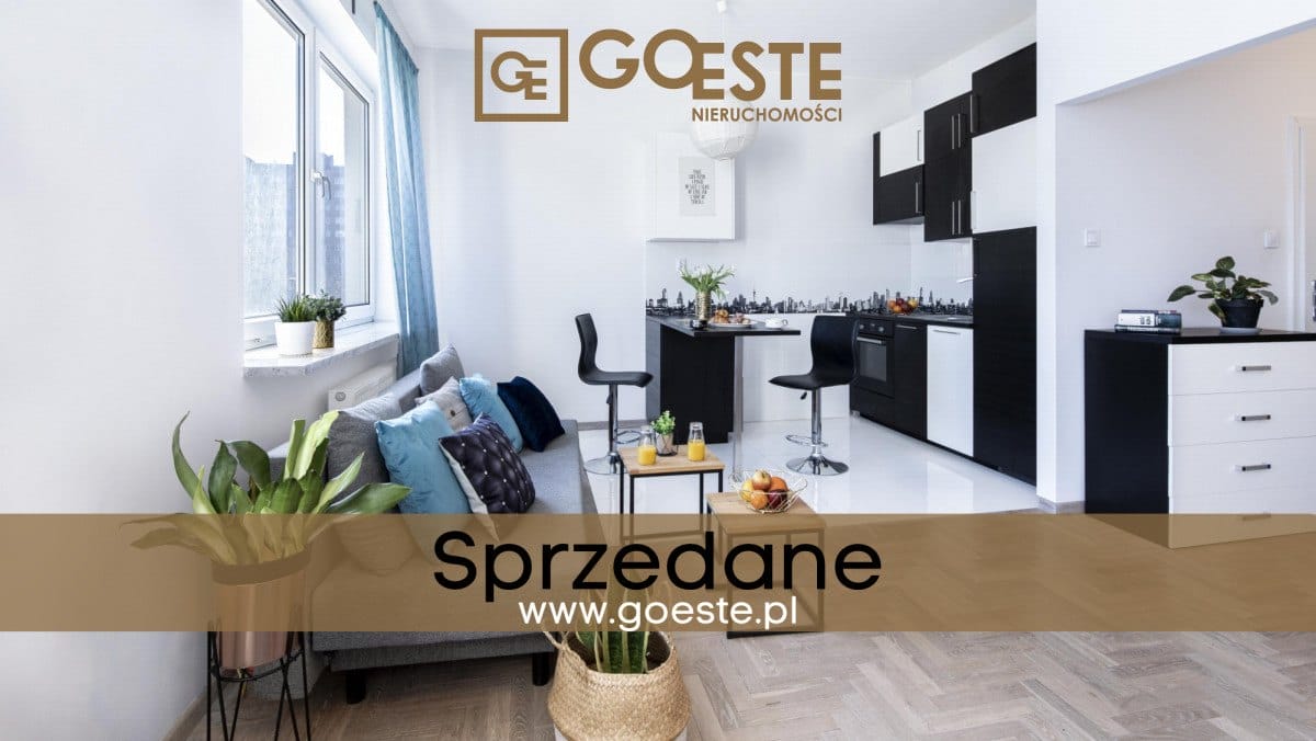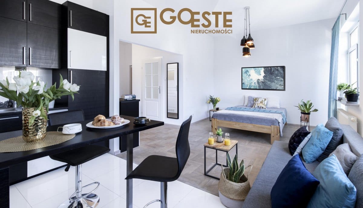 W części salonowej znajduje się przestronna kanapa, stolik kawowy oraz część jadalniana ze stołem i wygodnymi krzesłami barowymi. Strefa sypialniana z dużym, dwuosobowym łóżkiem znajduje się w wydzielonej części pokoju i posiada bezpośrednie wyjście na balkon, co sprawia, że przestrzeń jest jasna i przyjemna. Na podłodze w całym mieszkaniu zachowano drewniany parkiet, który dodaje wnętrzu przytulności i stylowego charakteru.