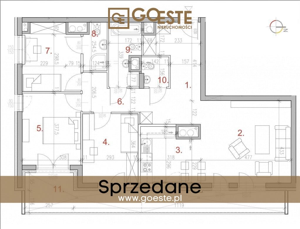 – trzech sypialni (11,63 m2, 10,67 m2 i 10,43 m2)