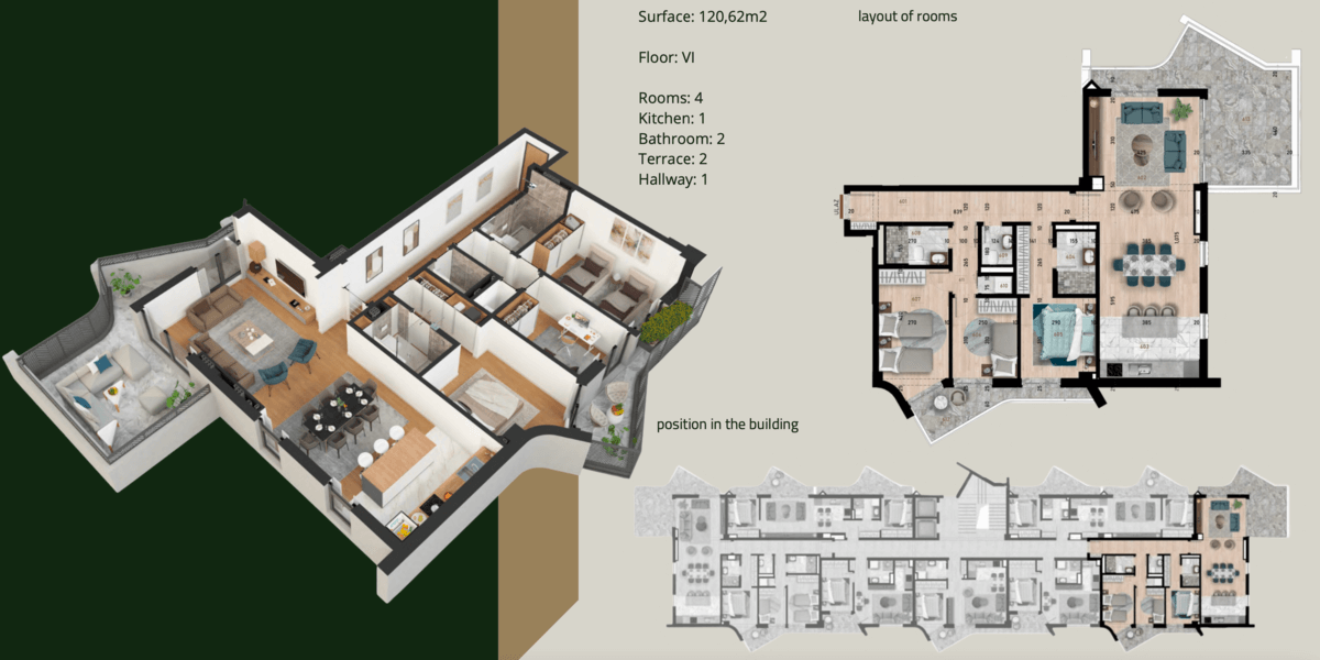 Mieszkanie usytuowane jest na ostatnim piętrze budynku, który wyróżnia się solidnym wykonaniem i funkcjonalnym rozkładem pomieszczeń. Projekt przewiduje wiele wariantów mieszkań dostosowanych do różnych potrzeb przyszłych właścicieli.